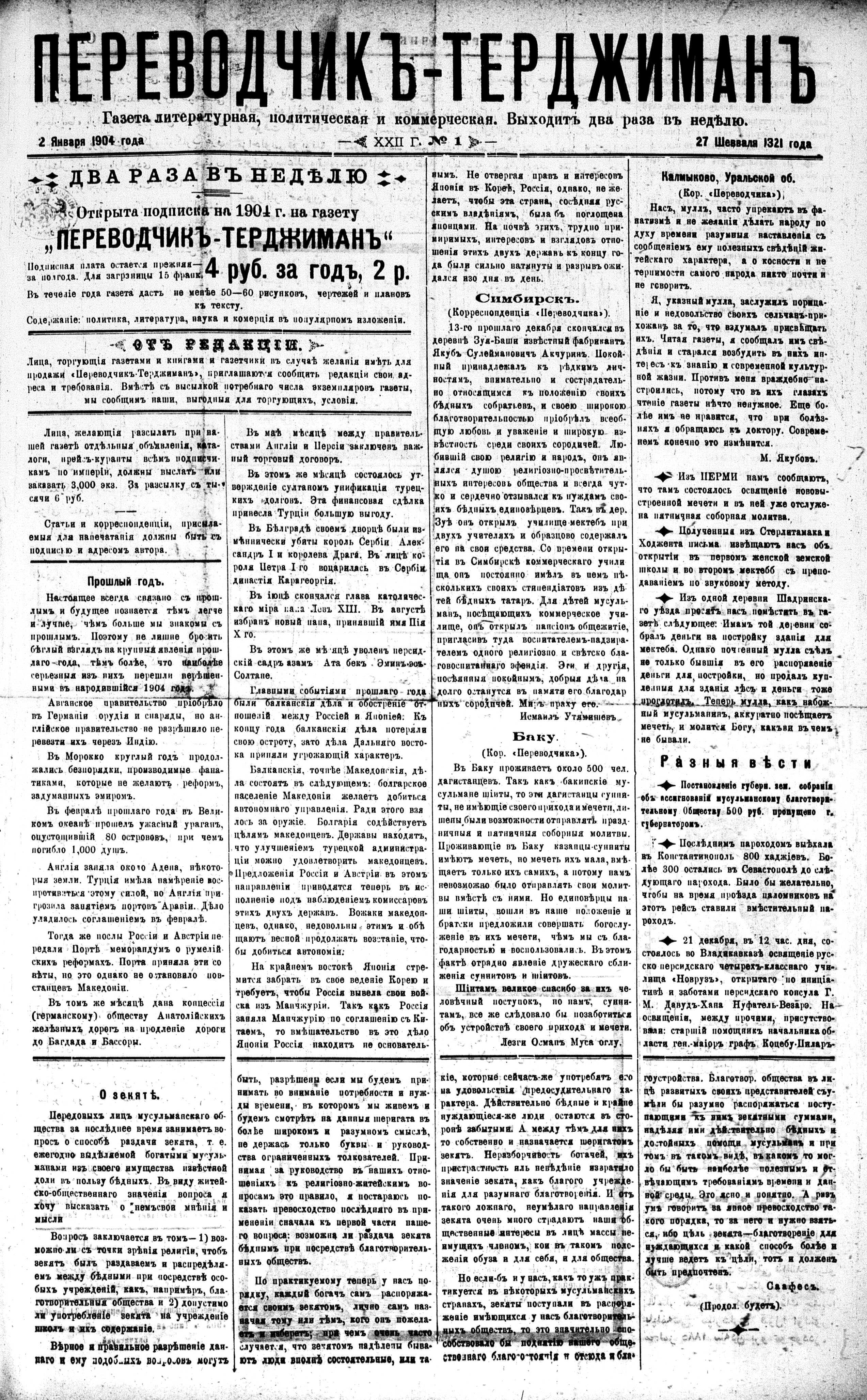 Tercüman, 02 January 1904 Year 22 No 1