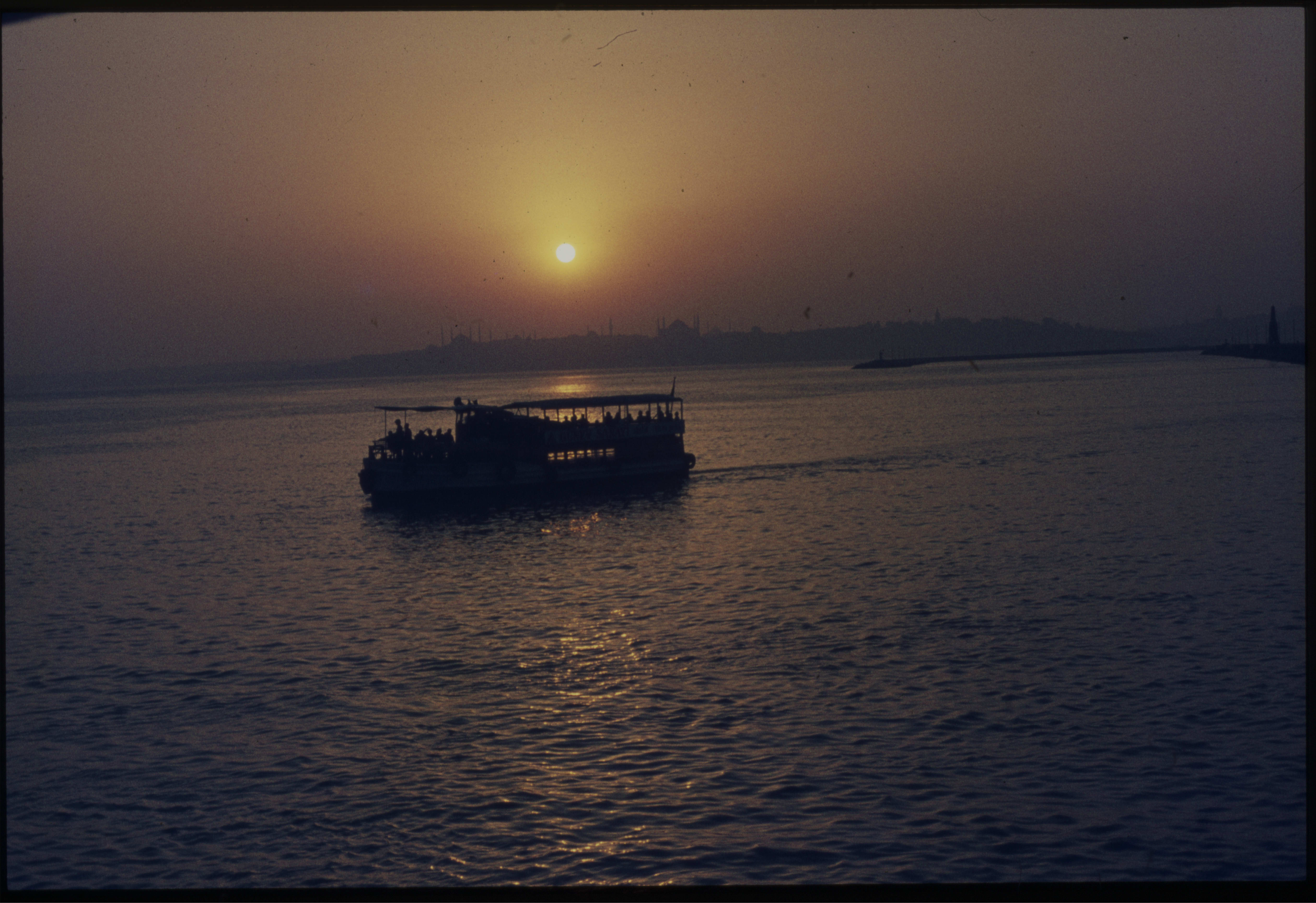 Güneş batarken Haydarpaşa'dan Ayasofya ve Sultan Ahmed Camiilerinin görünüşü