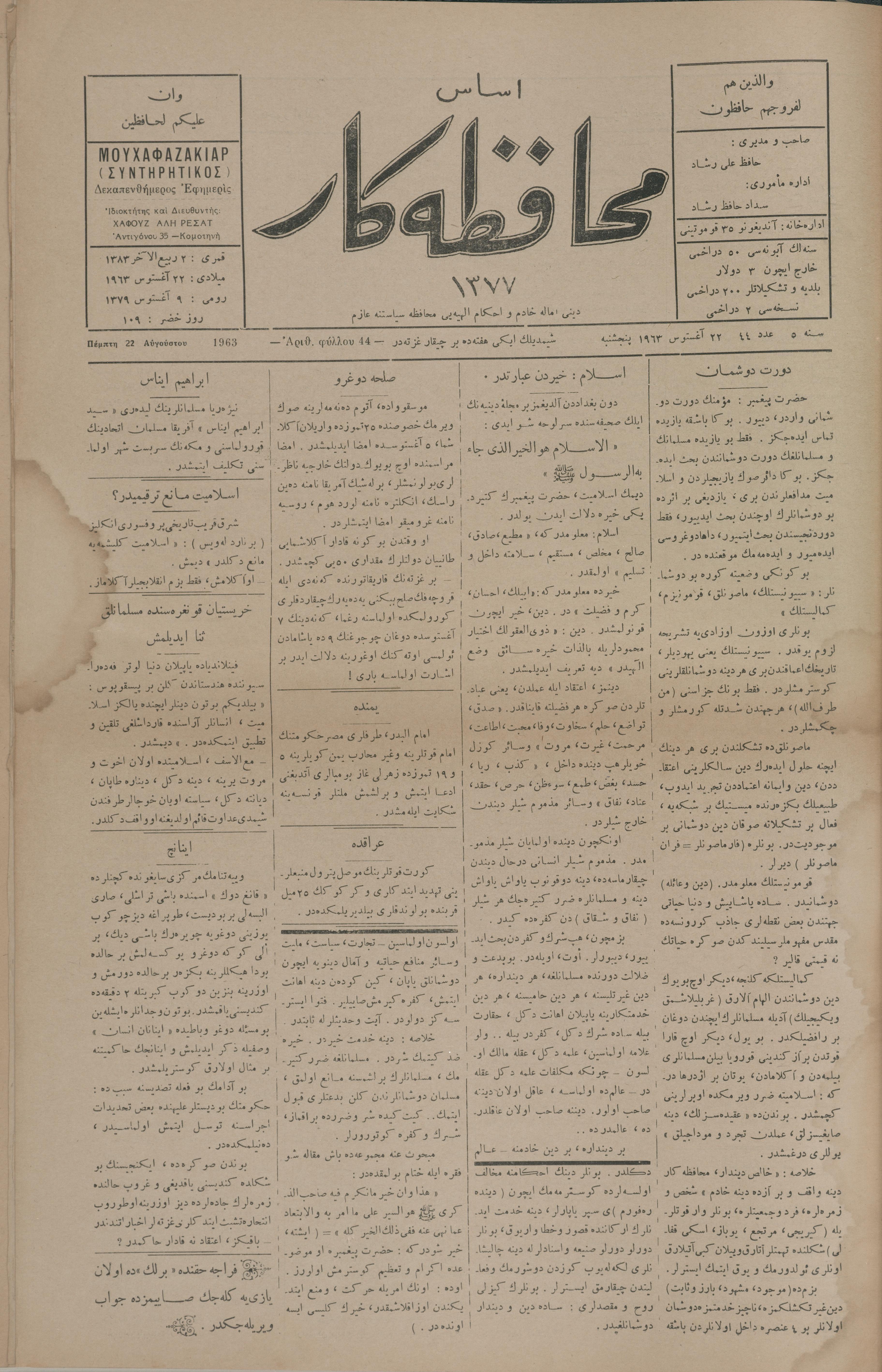 Esas muhafazakâr 1377, 22 Ağusos 1963 Sene 5 Aded 44