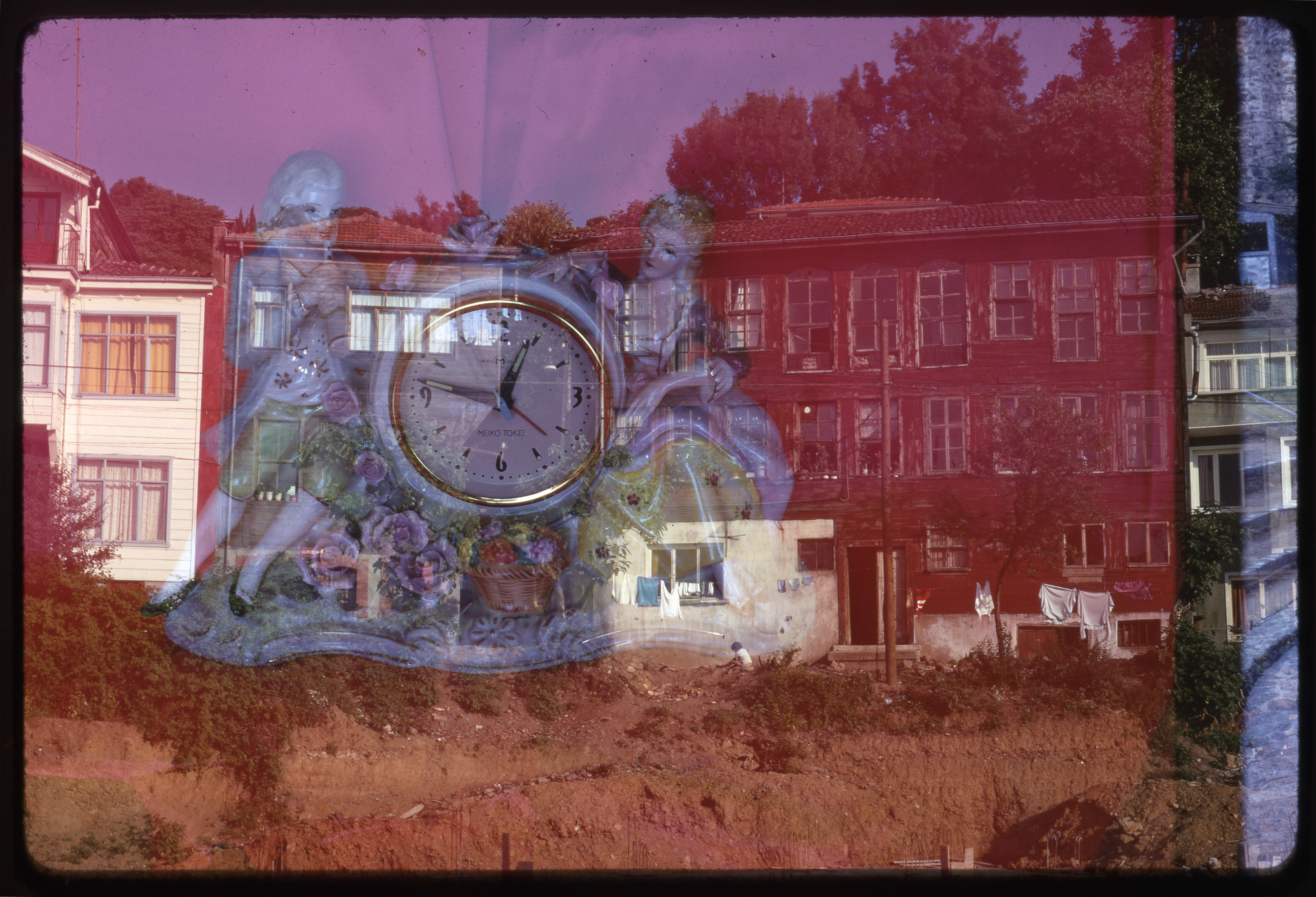 İstanbul-Ahşap evlerin üzerine bir saat görüntüsü düşürülerek yapılmış olan bir fotomontaj