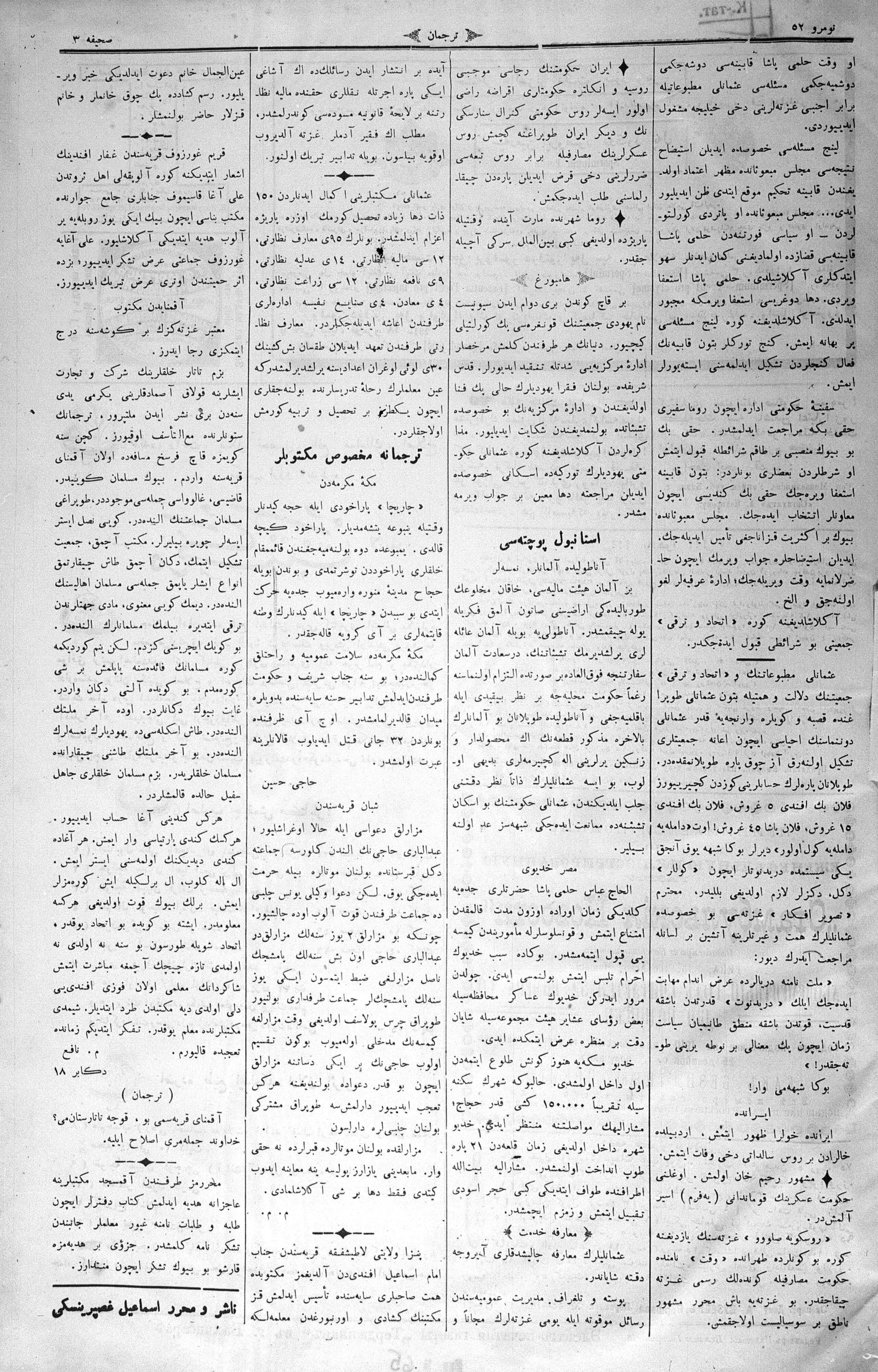 The name of the newspaper changed to Tercüman-ı Ahval-i Zaman in 1905. In 1909, it started to be published under its first name, Tercüman.