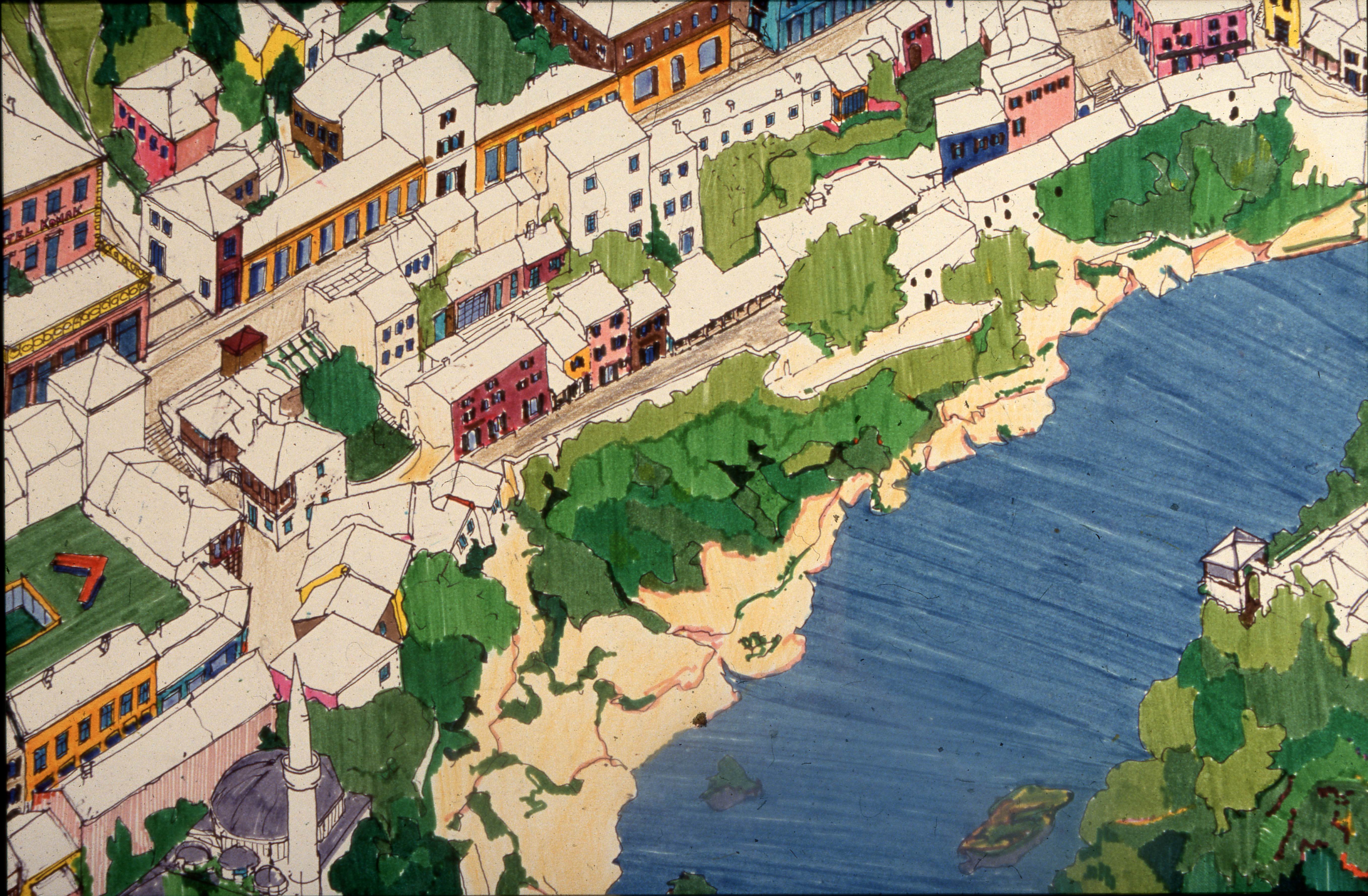 Axonometric drawing of the Neretva River and its surroundings in Mostar by Amir Pašić