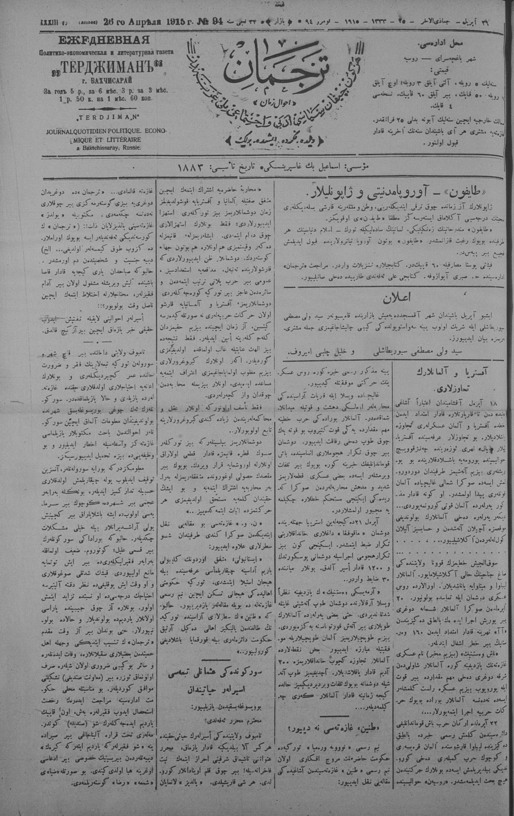 Tercüman, 26 April 1915 Year 33 No 94
