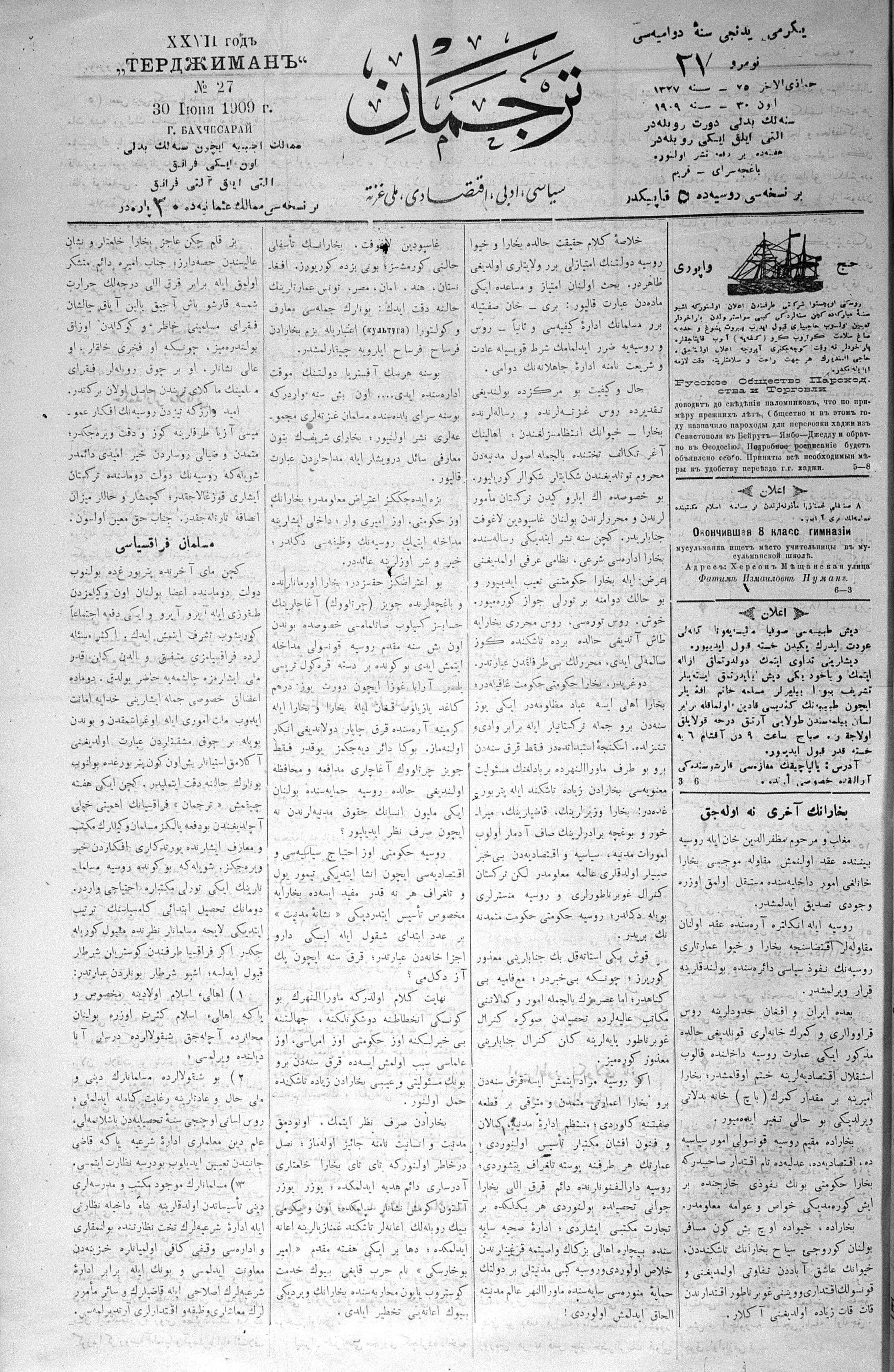 Tercüman, 30 June 1909 Year 27 No 27