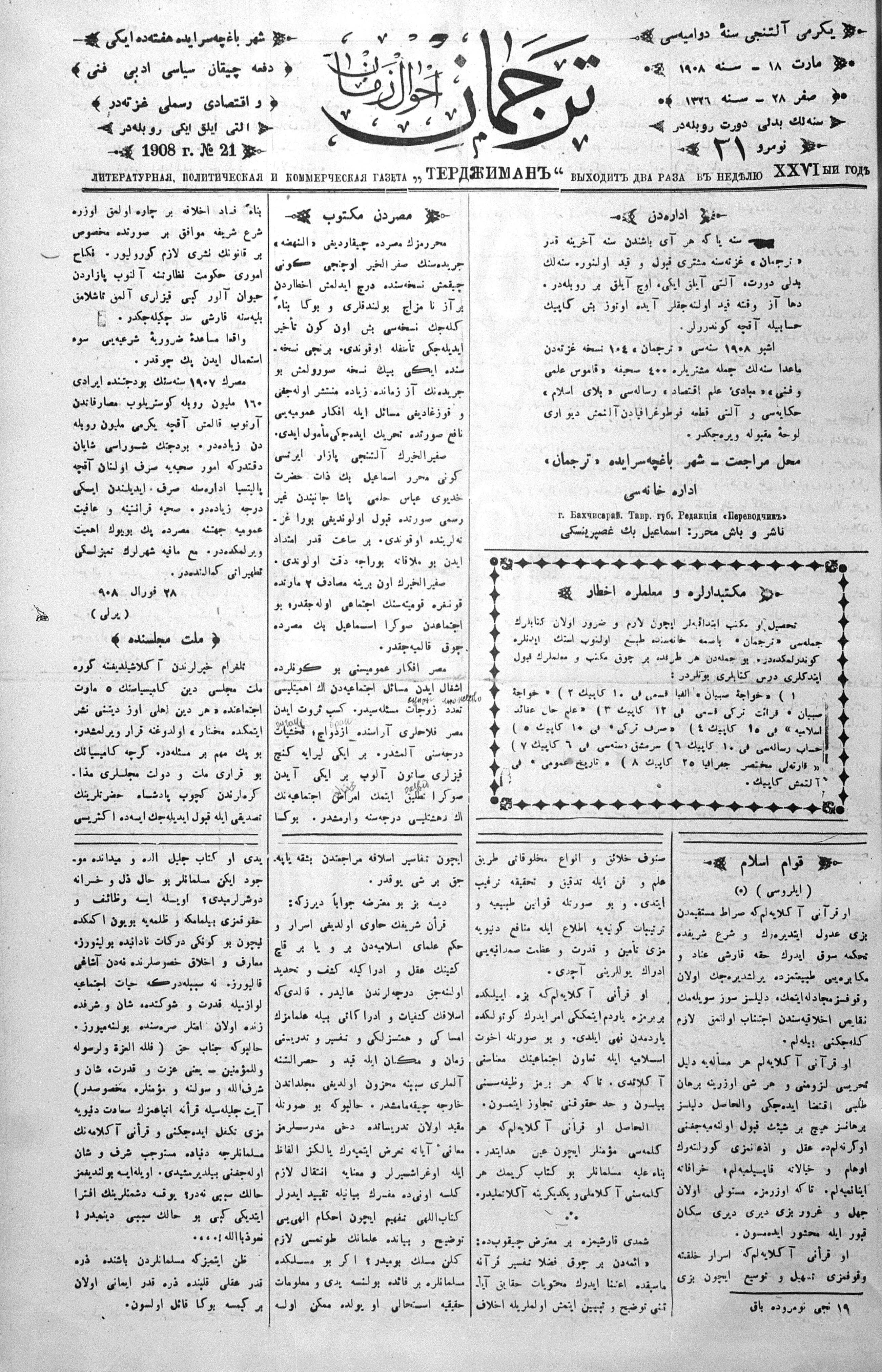 Turkish-Russian newspaper published in Crimea by İsmail Gaspıralı.