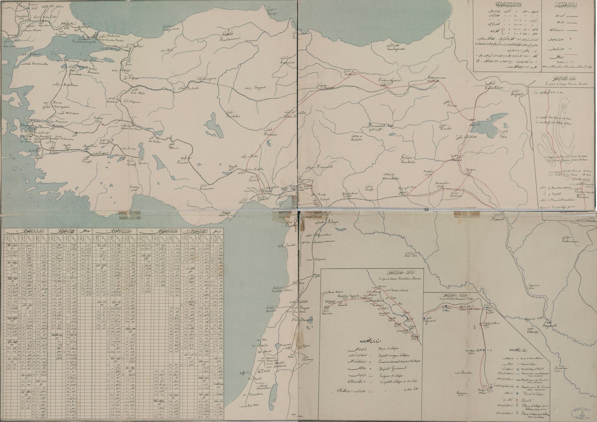 With: Fırat Nehrine aid maalumat.- Pozanti-Kulek menzil hattı= Ligne d'etape Pozanti-Kulek.- Ras al-Ayn-Musul menzil hattı= Ligne d'etape ResulAin Mossoul.- Osmaniyye-Racu menzil hattı= Ligne d'etape Osmanié-Radjo