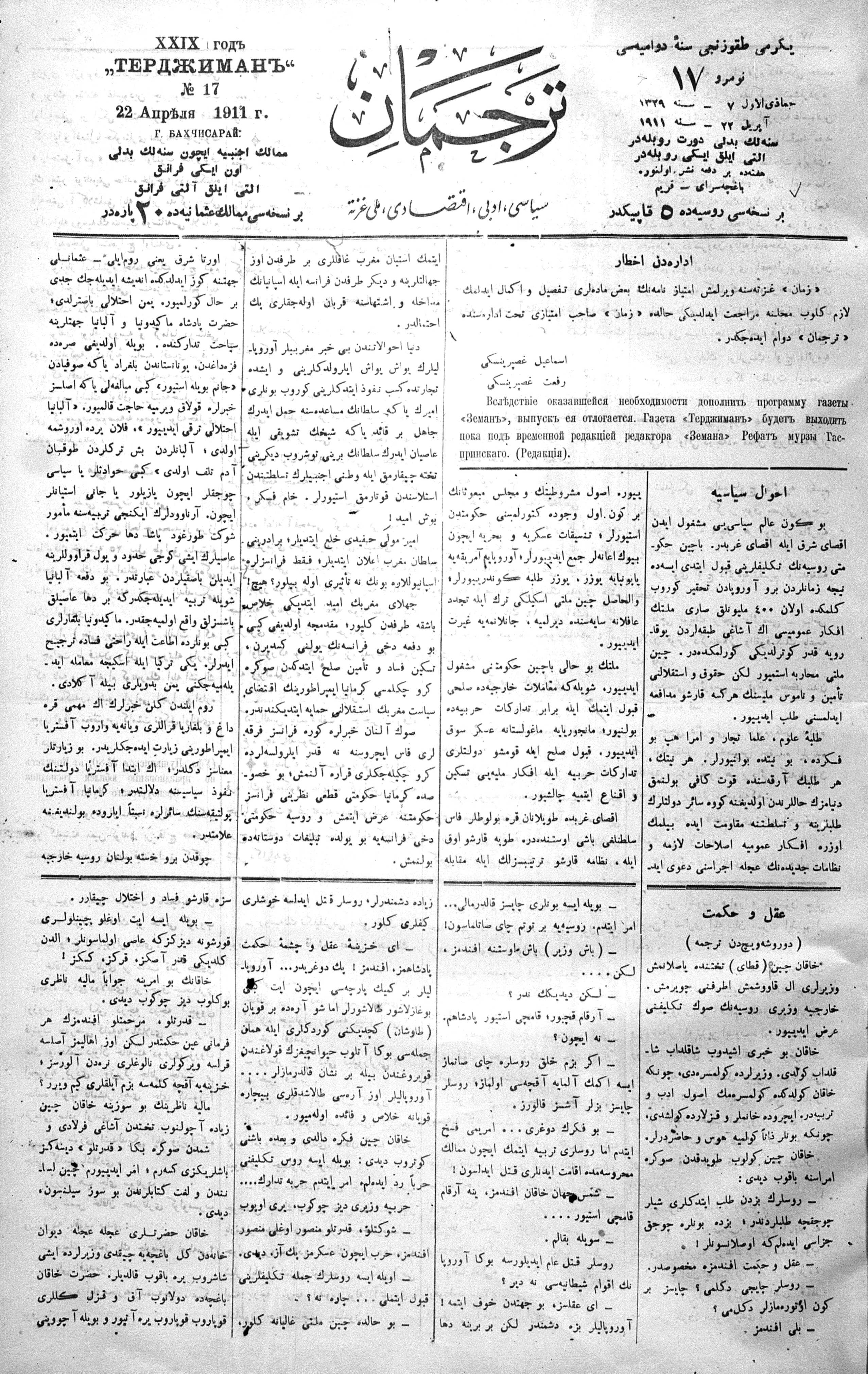Tercüman, 22 April 1911 Year 29 No 17