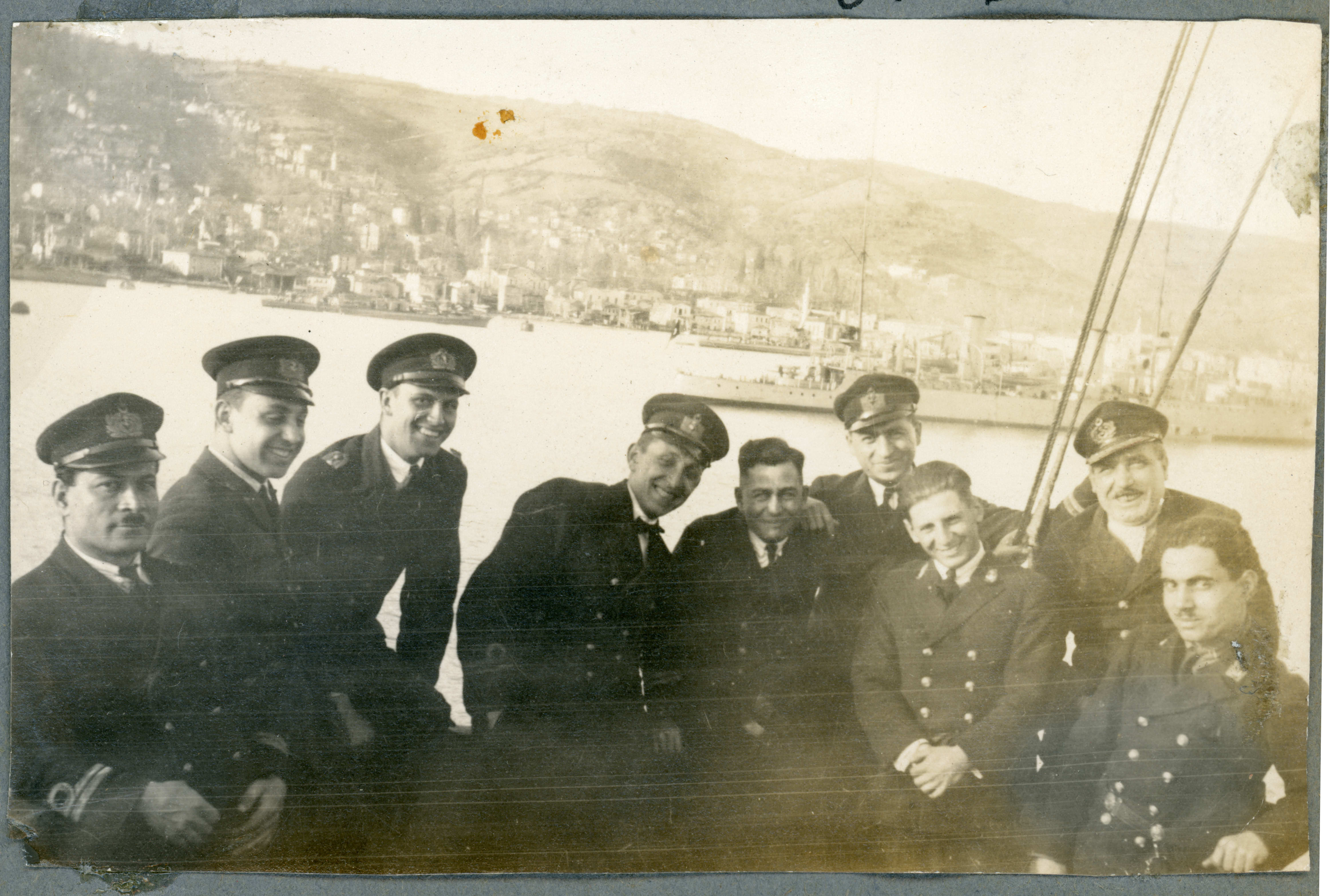 Türk donanma gemileri Boğaziçi'nden geçerken gemi güvertesinde fotoğraf çektiren bahriye subayları