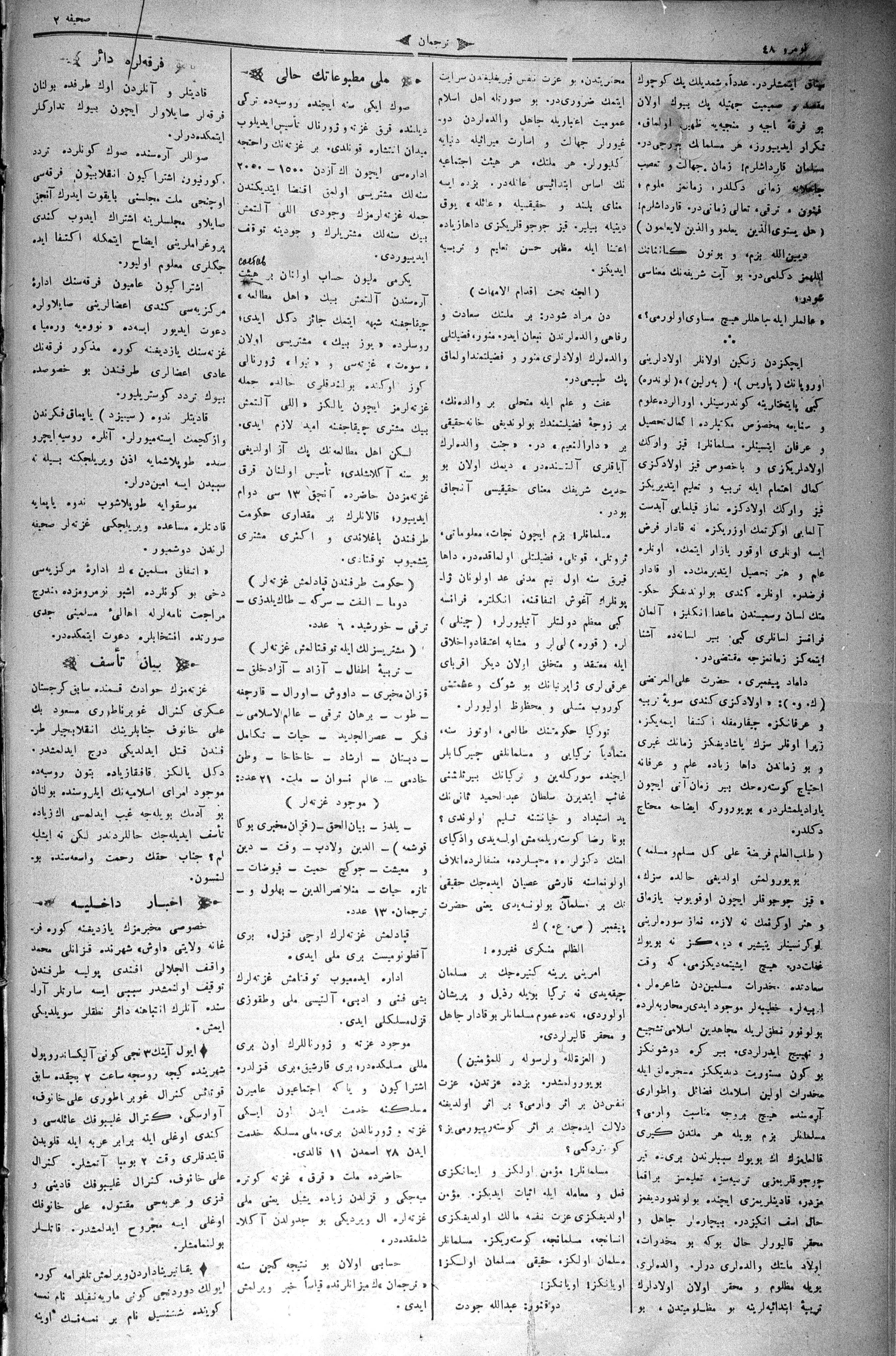 The name of the newspaper changed to Tercüman-ı Ahval-i Zaman in 1905. In 1909, it started to be published under its first name, Tercüman.