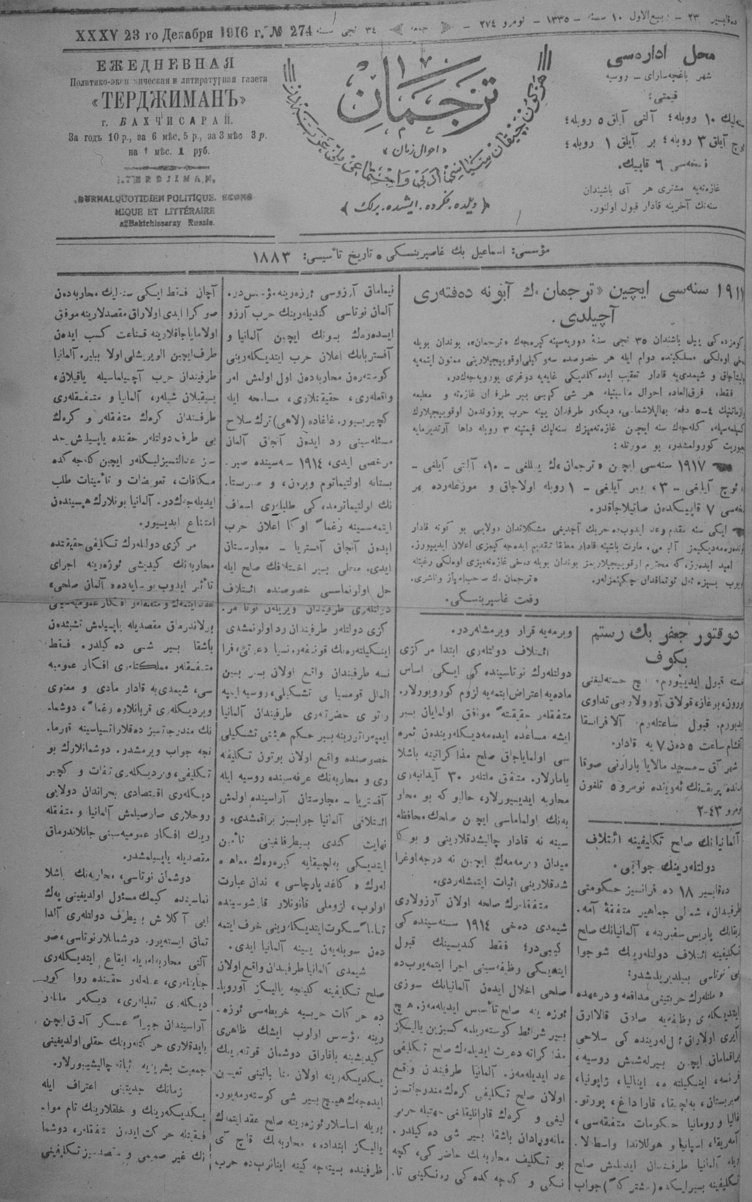 Tercüman, 23 December 1916 Year 34 No 274