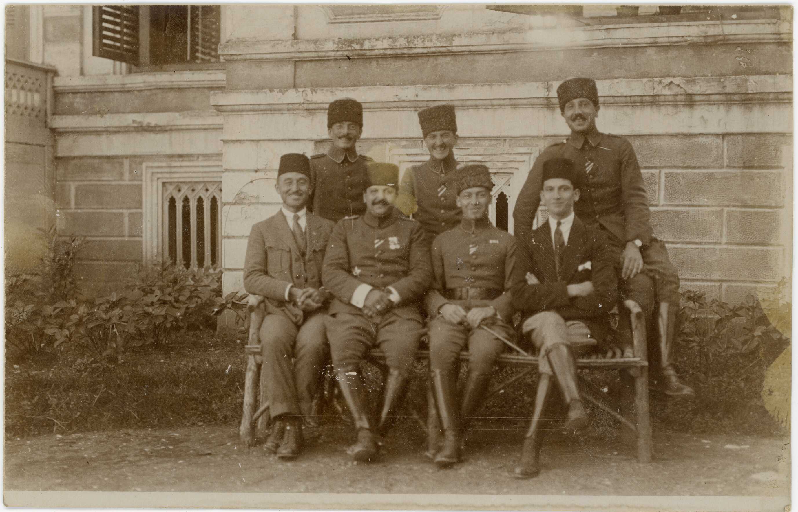 Those sitting: Ekrem Rüştü Akömer (Third from the left), Mecdi Hüsameddin (Fourth from the left), Standing: Teğmen Saim Önhon (Third from the left).