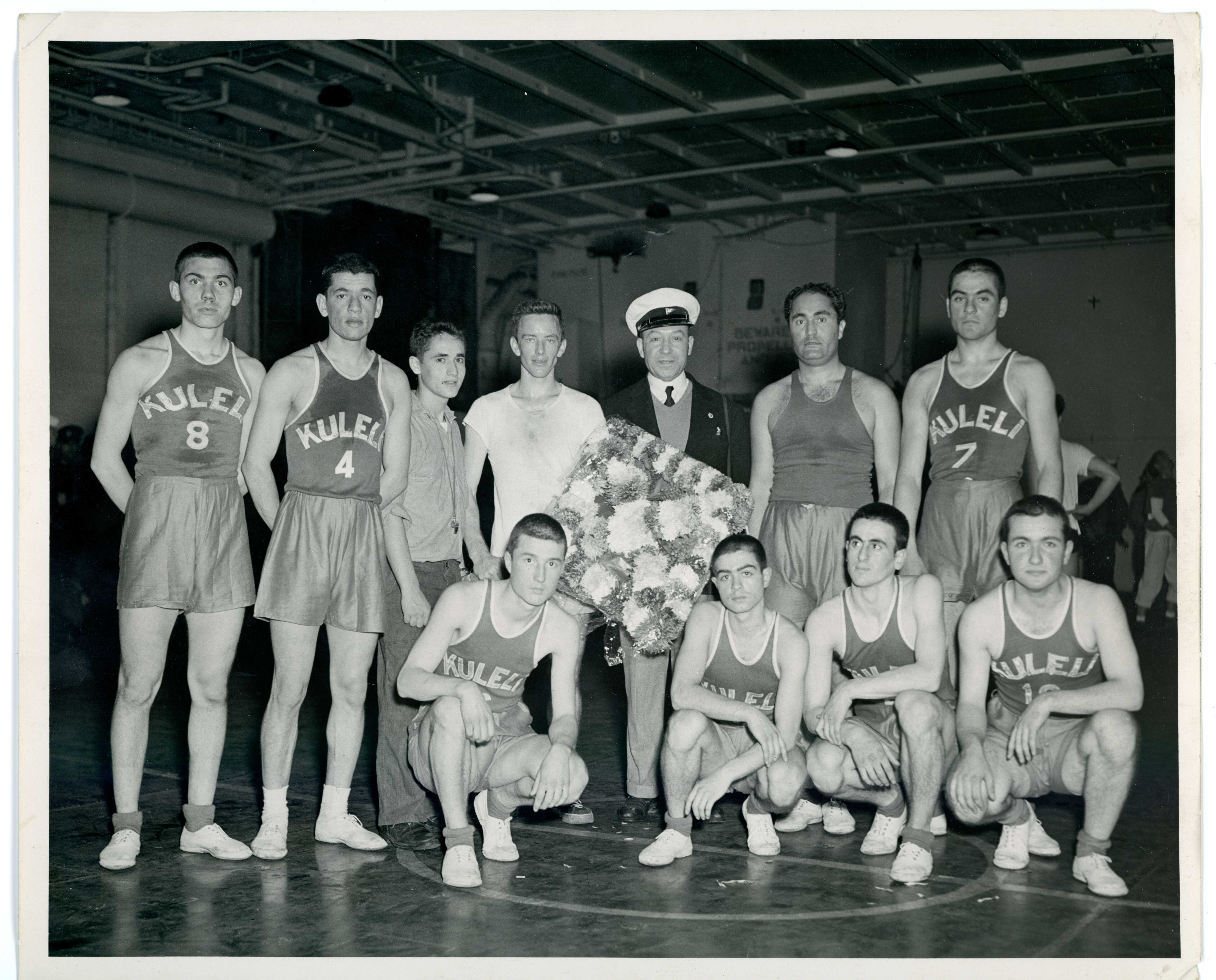 Kuleli Military High School basketball team with referee and J. Lancaster (Et-1) and while Captain Ekrem Akömer after game aboard the F.D.R.