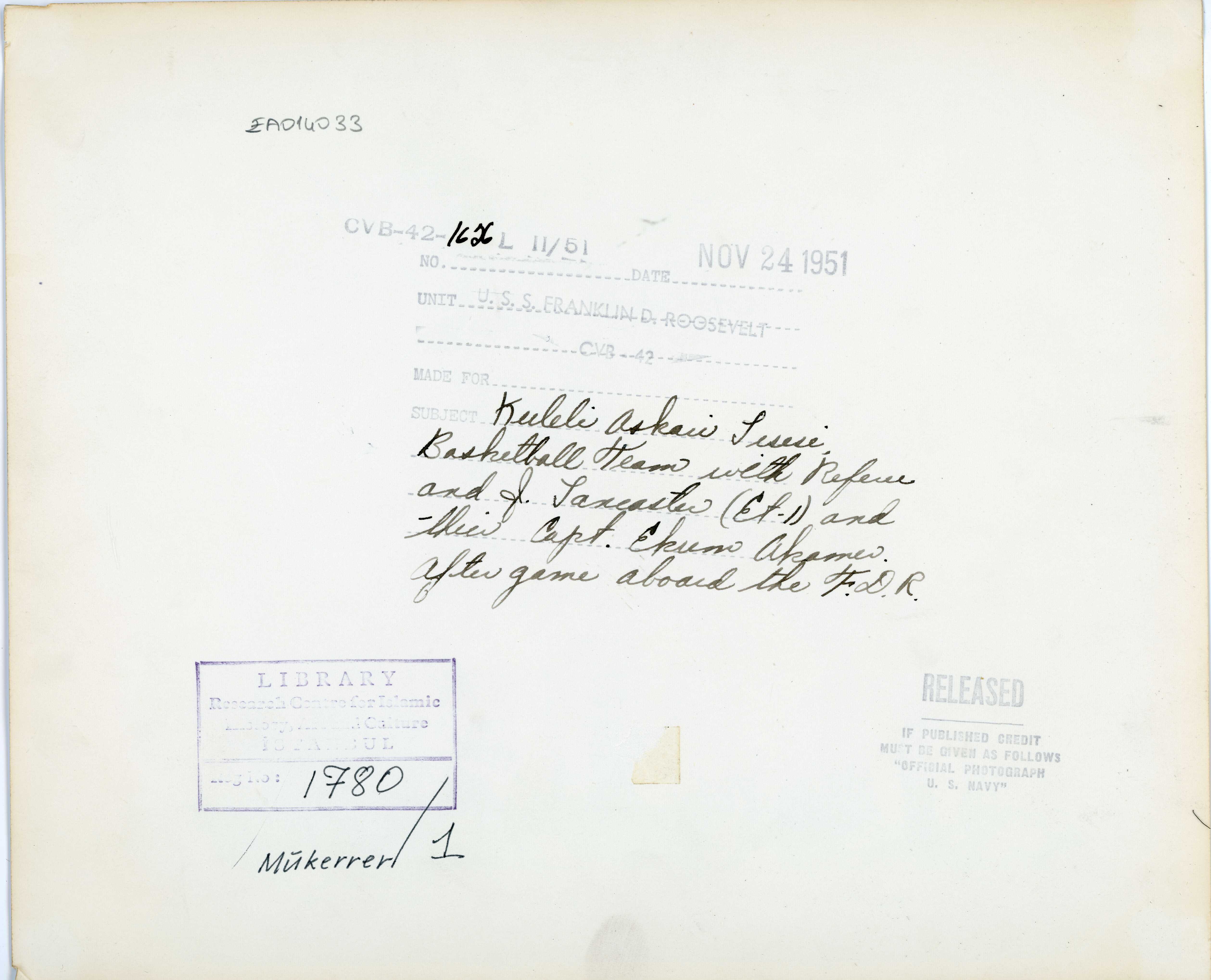 Koruyucu, Necdet, Lancaster, J., Akömer, Ekrem Rüştü, 1892-1984, Kuleli Military High School Basketball Team, Kuleli Military High School (Üsküdar)-İstanbul, U.S.S. Franklin D. Roosevelt, Üsküdar-İstanbul-Turkey