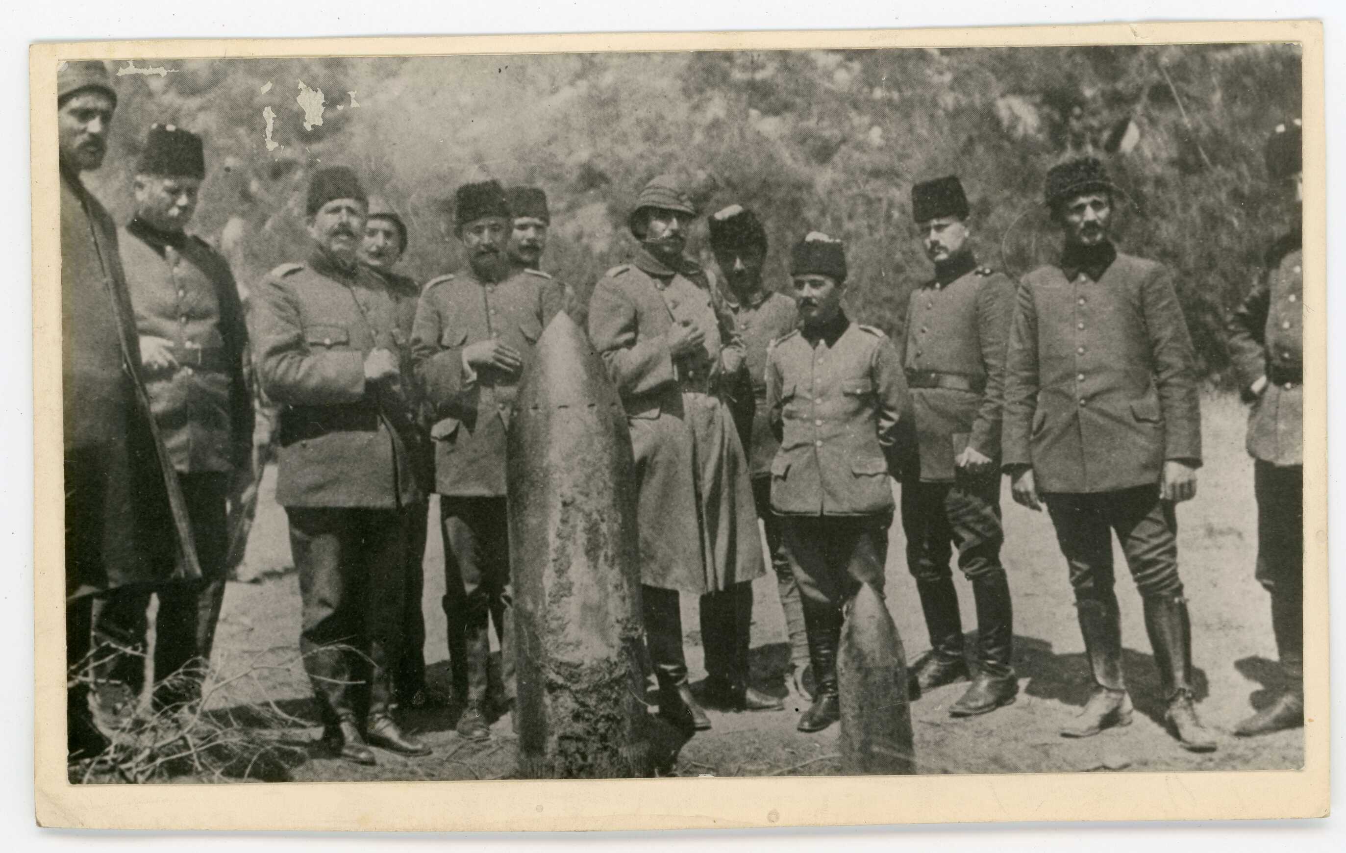 Çanakkale Harbi'nde patlamamış bir düşman mermisi önünde Türk subayları