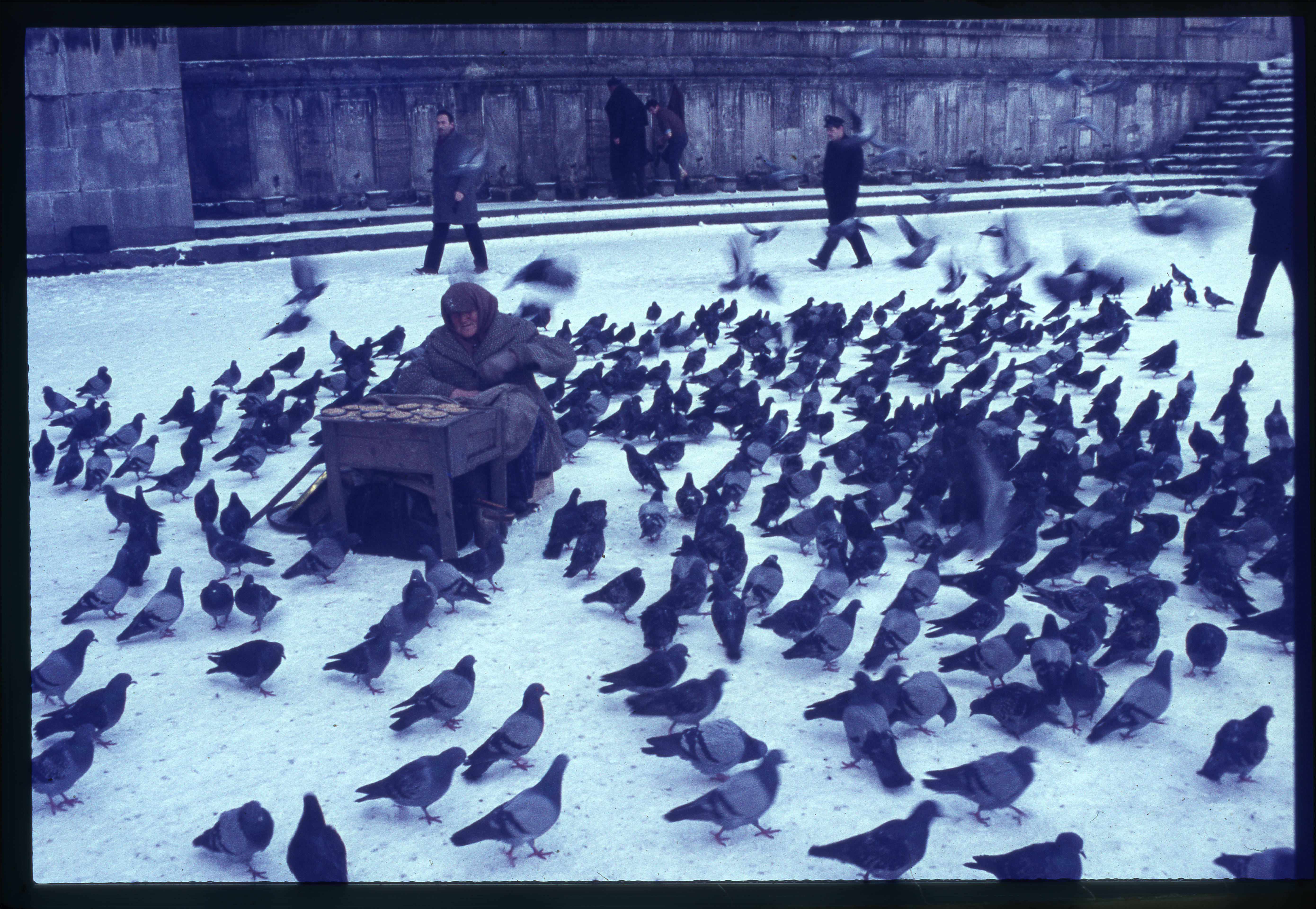 İstanbul-Karda Yeni Camii Meydanı'nda güvercinler ve bir yem satıcısı