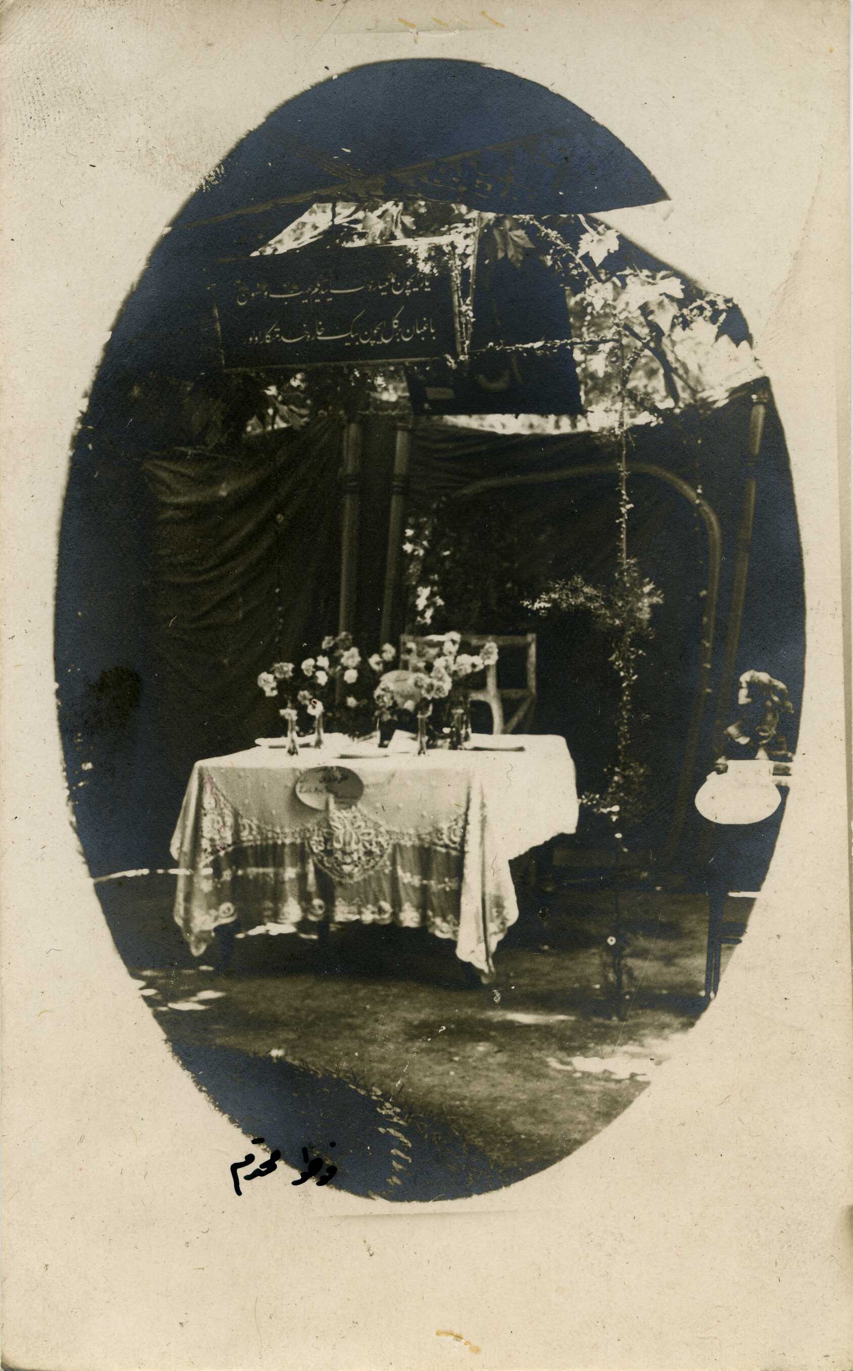 "Yâr içün ağyâre minnet etdiğim ayb eylemen Bâğbân bir gül içün bin hare hizmetkâr olur" şeklinde talik hat ile yazılmış Fuzuli'nın şiiri ve çiçekler ile donatılmış bir masa