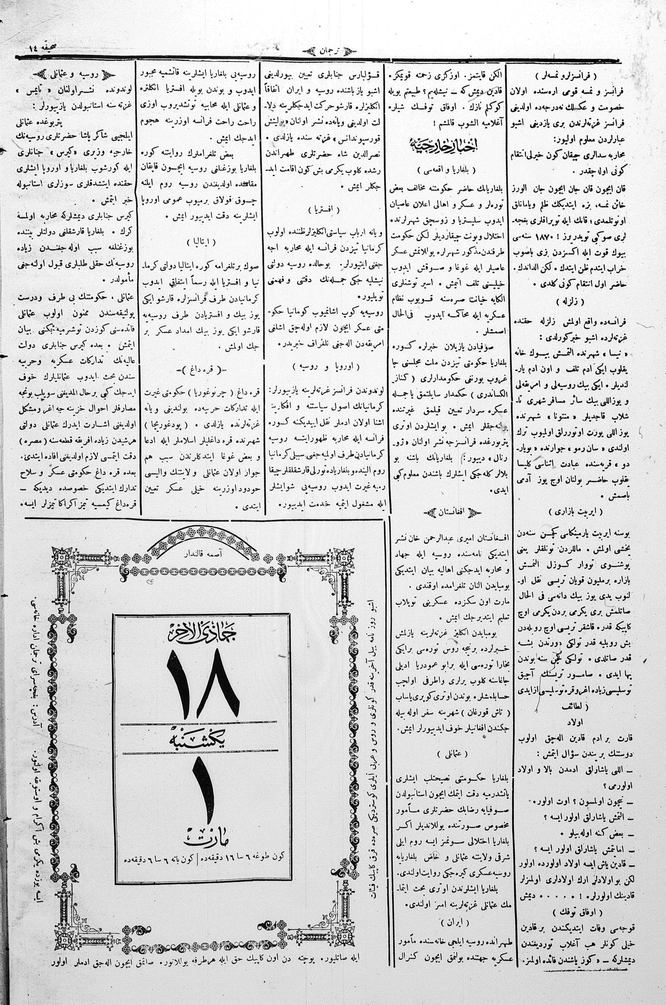 The name of the newspaper changed to Tercüman-ı Ahval-i Zaman in 1905. In 1909, it started to be published under its first name, Tercüman.