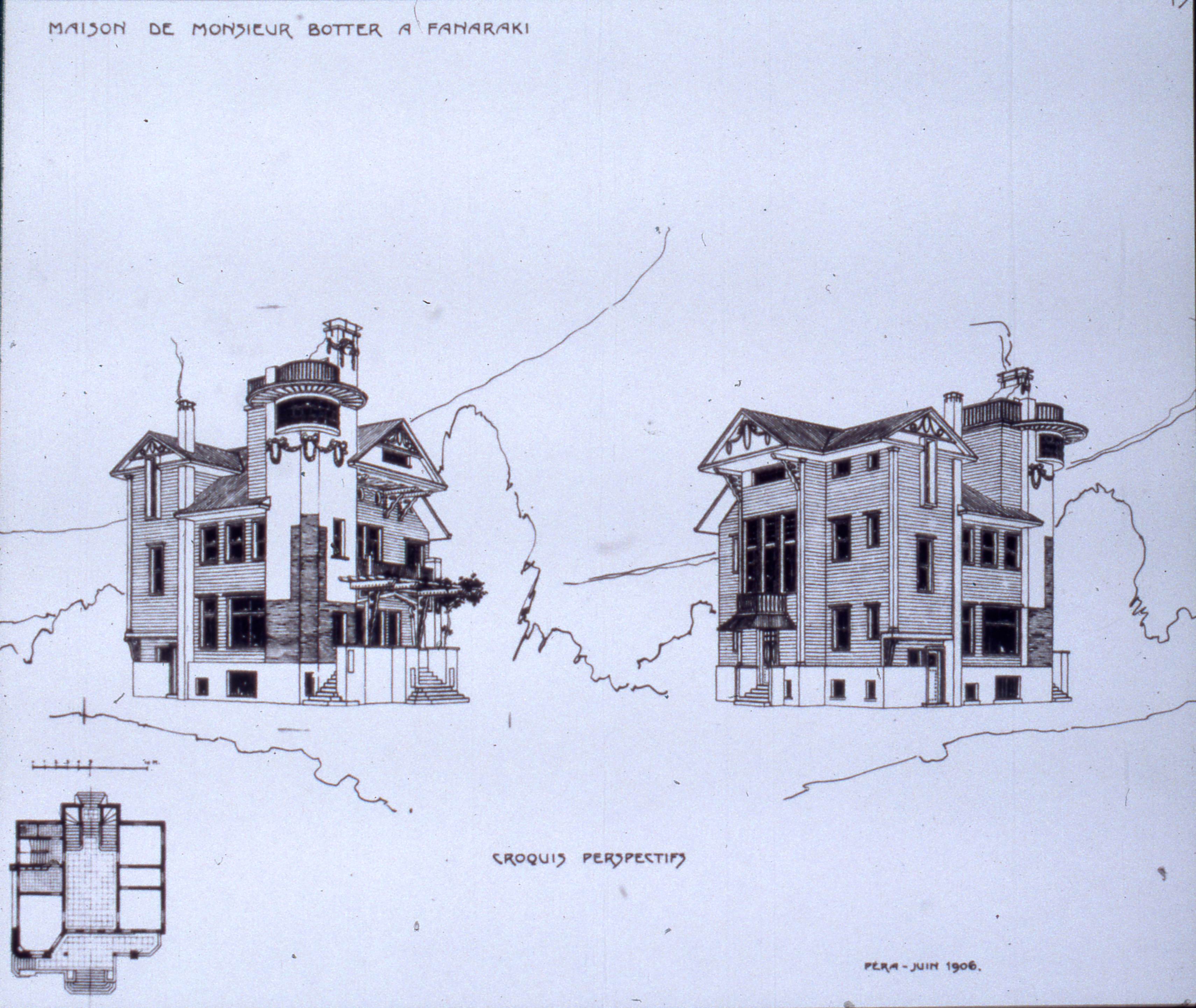 Perspective views and plan of the Botter House in Fenerbahçe