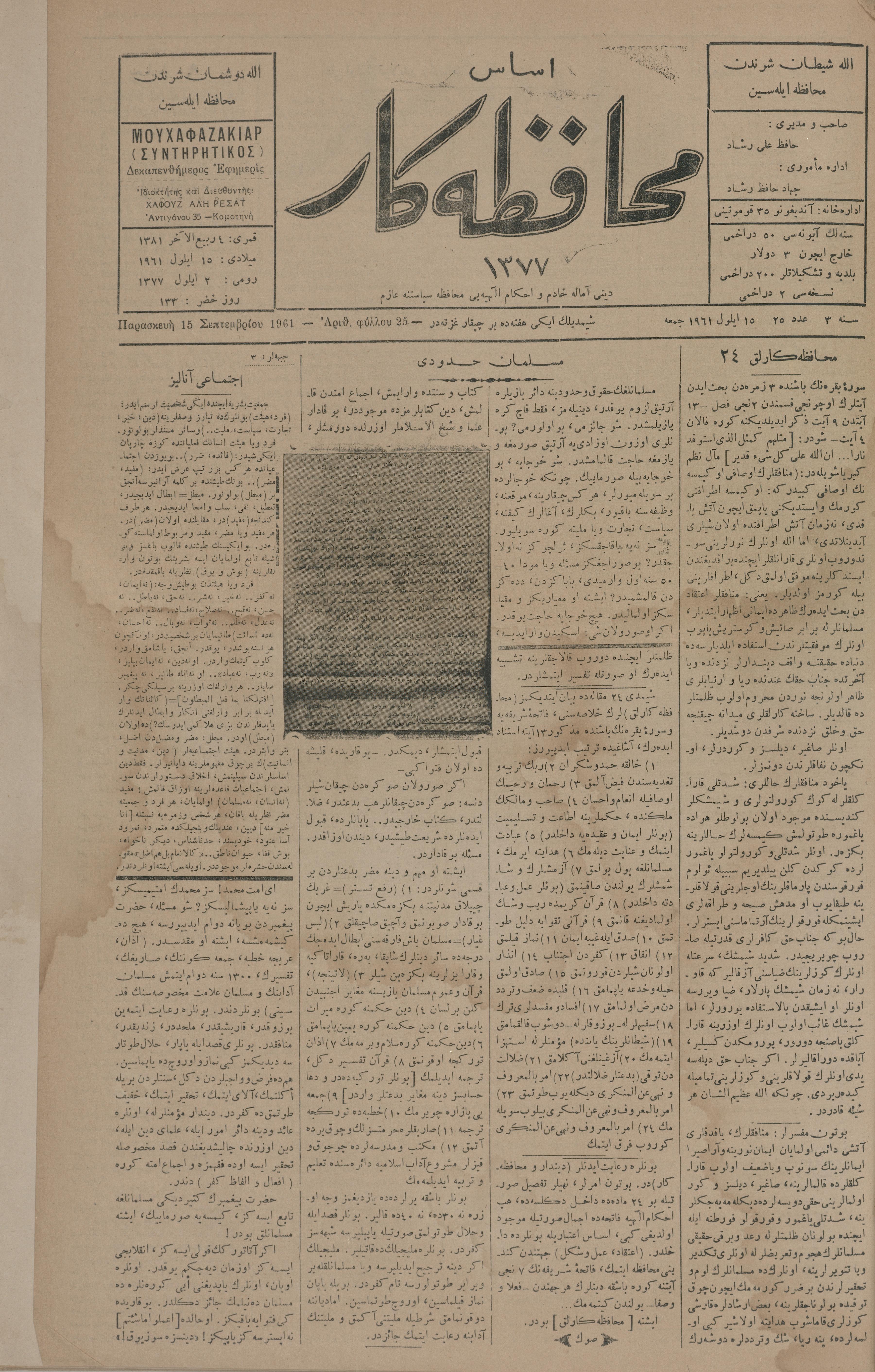 Esas muhafazakâr 1377, 15 Eylül 1961 Sene 3 Aded 25