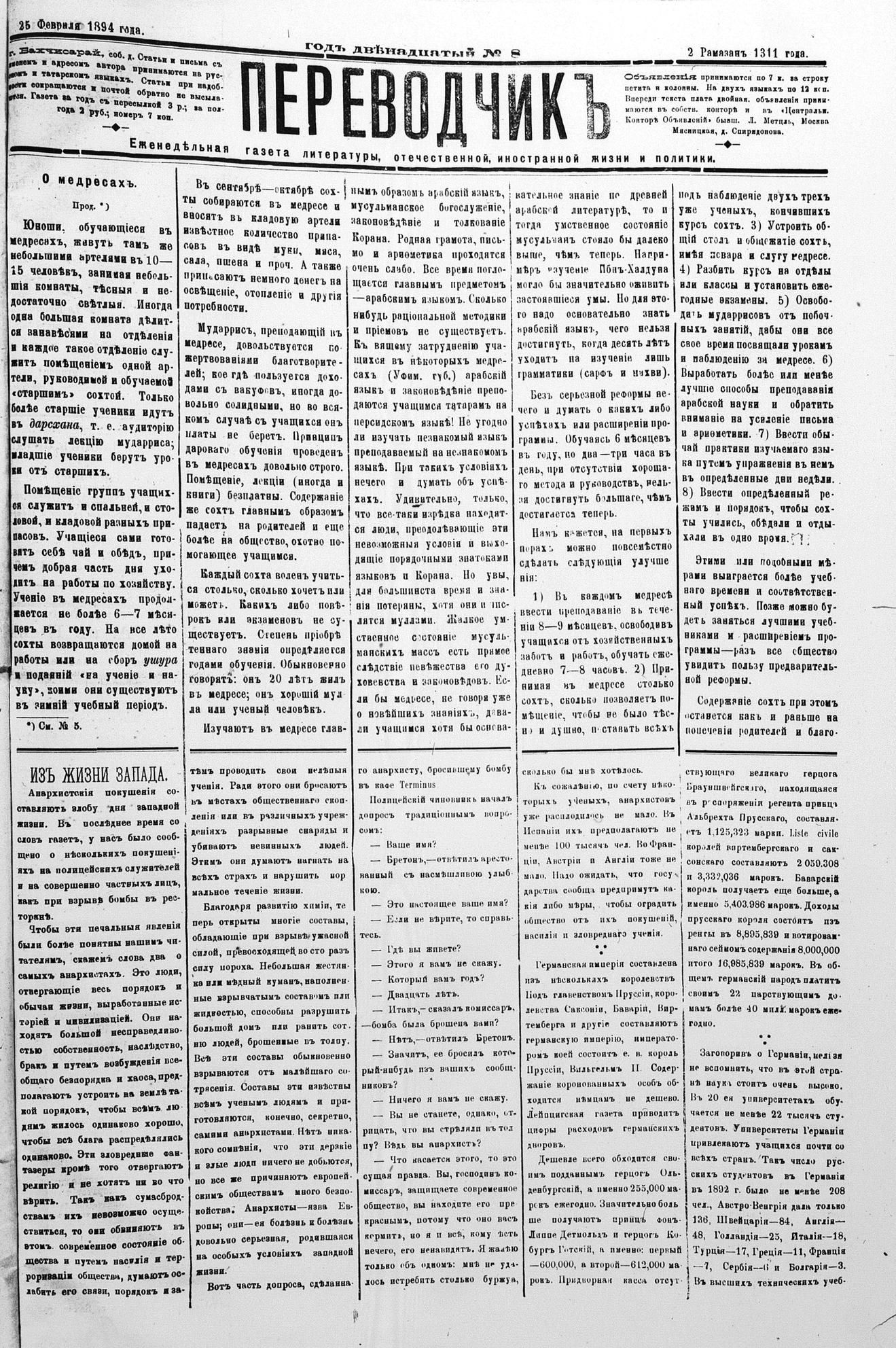 Tercüman, 25 February 1894 Year 12 No 8