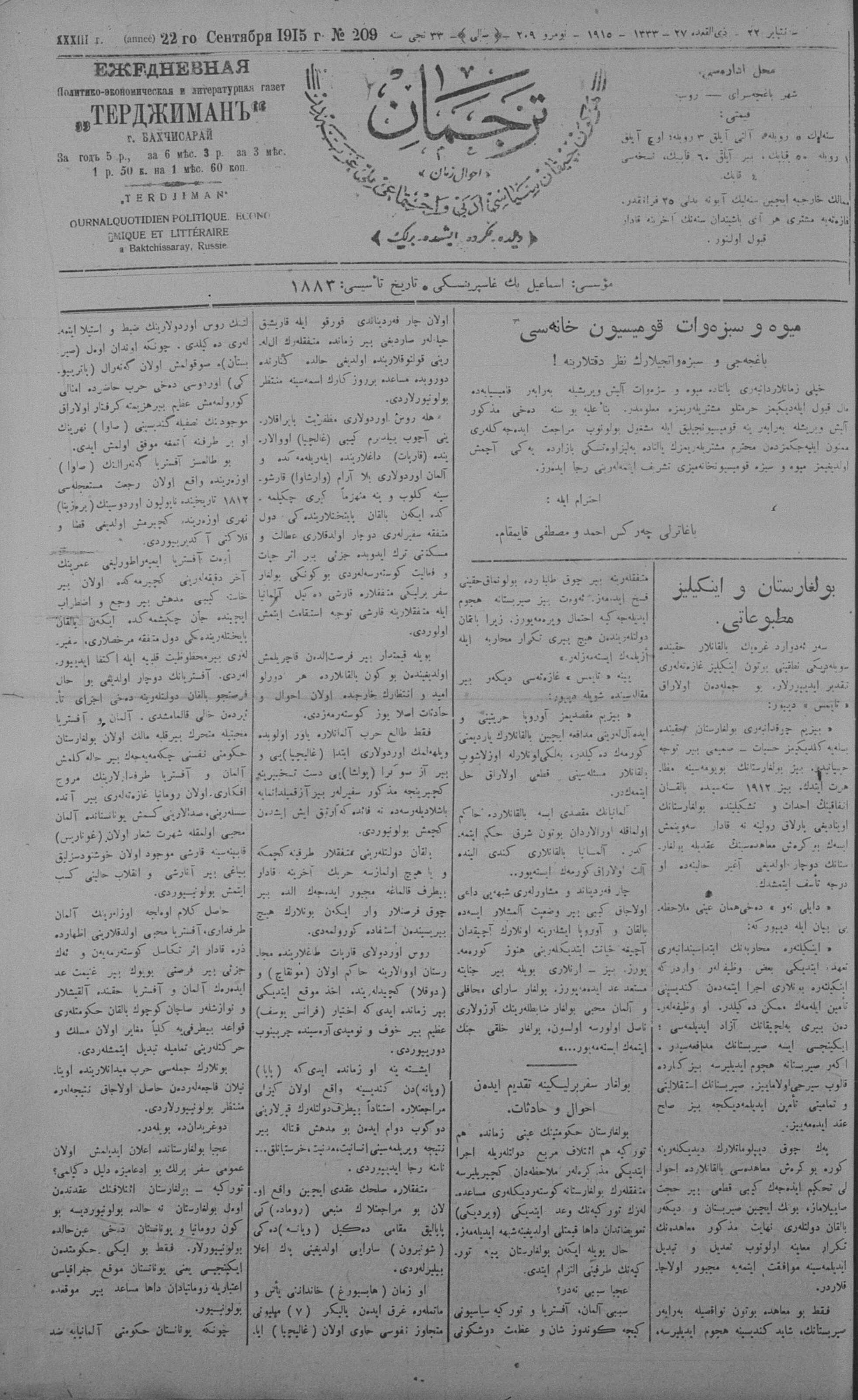 Tercüman, 22 September 1915 Year 33 No 209