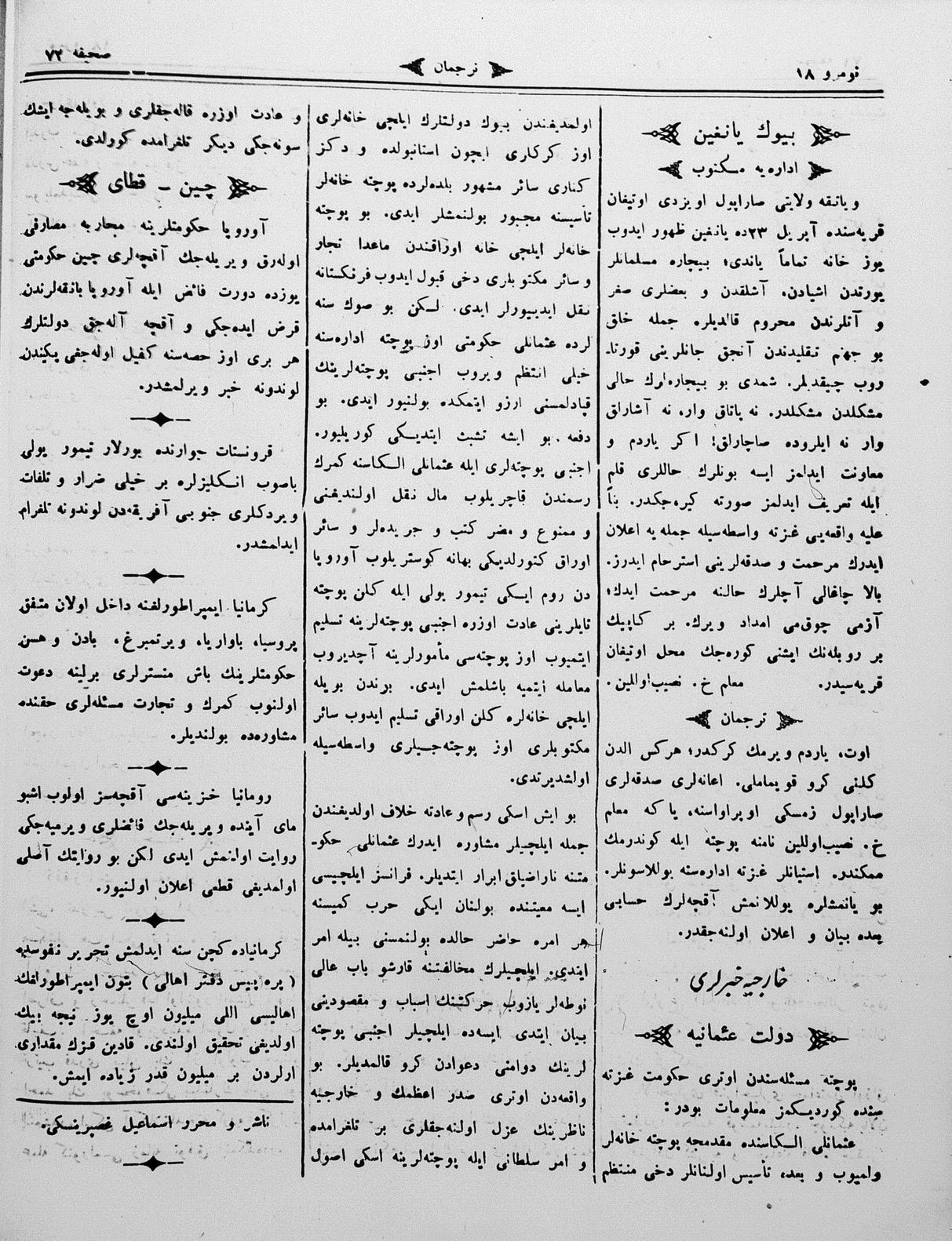 The name of the newspaper changed to Tercüman-ı Ahval-i Zaman in 1905. In 1909, it started to be published under its first name, Tercüman.