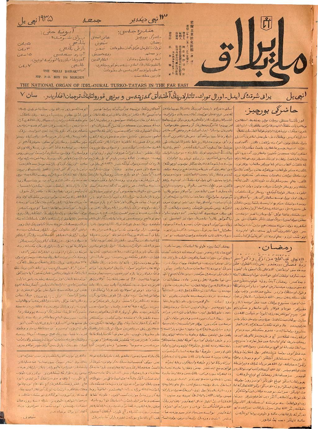 The Milli Bayrak newspaper was printed in Mukden.