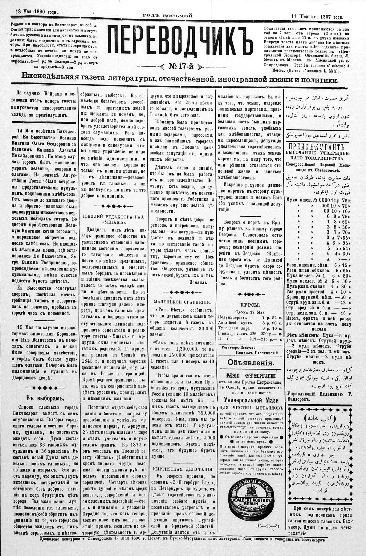 Turkish-Russian newspaper published in Crimea by İsmail Gaspıralı.