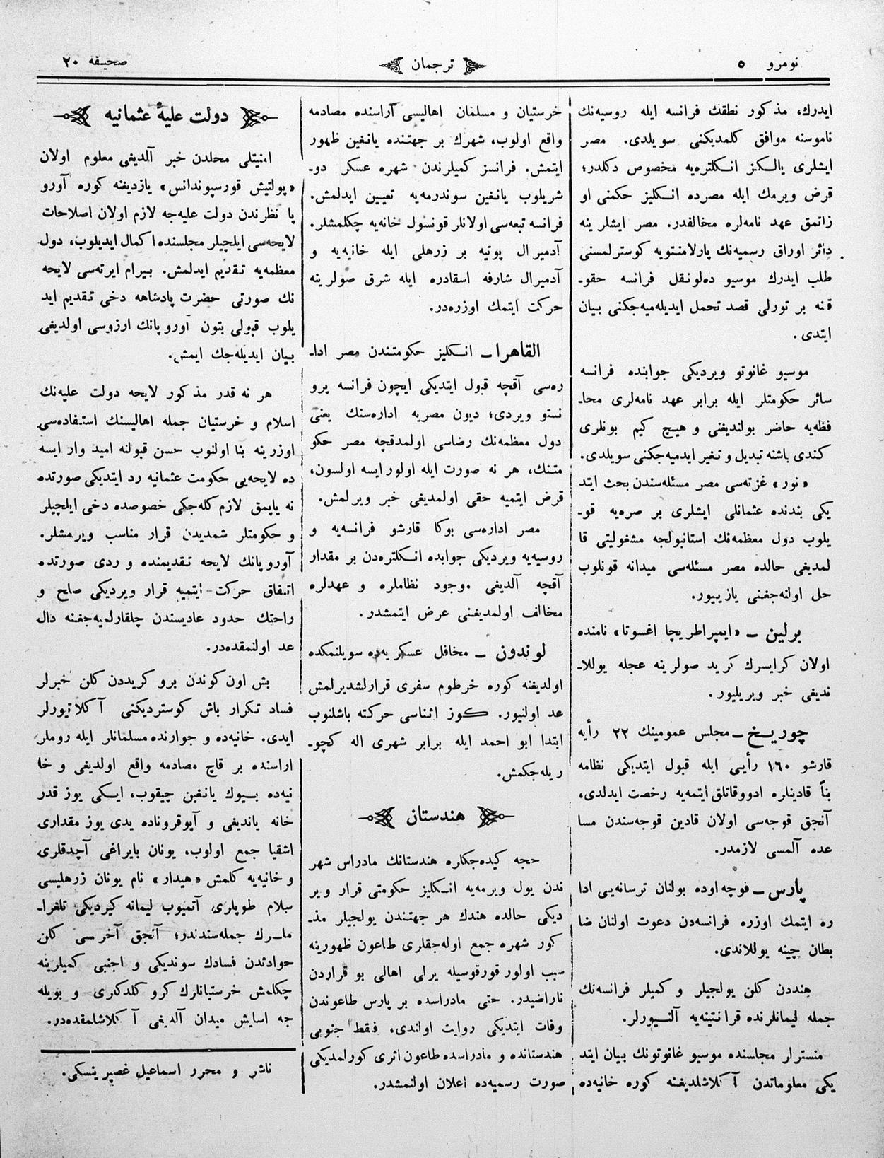 The name of the newspaper changed to Tercüman-ı Ahval-i Zaman in 1905. In 1909, it started to be published under its first name, Tercüman.