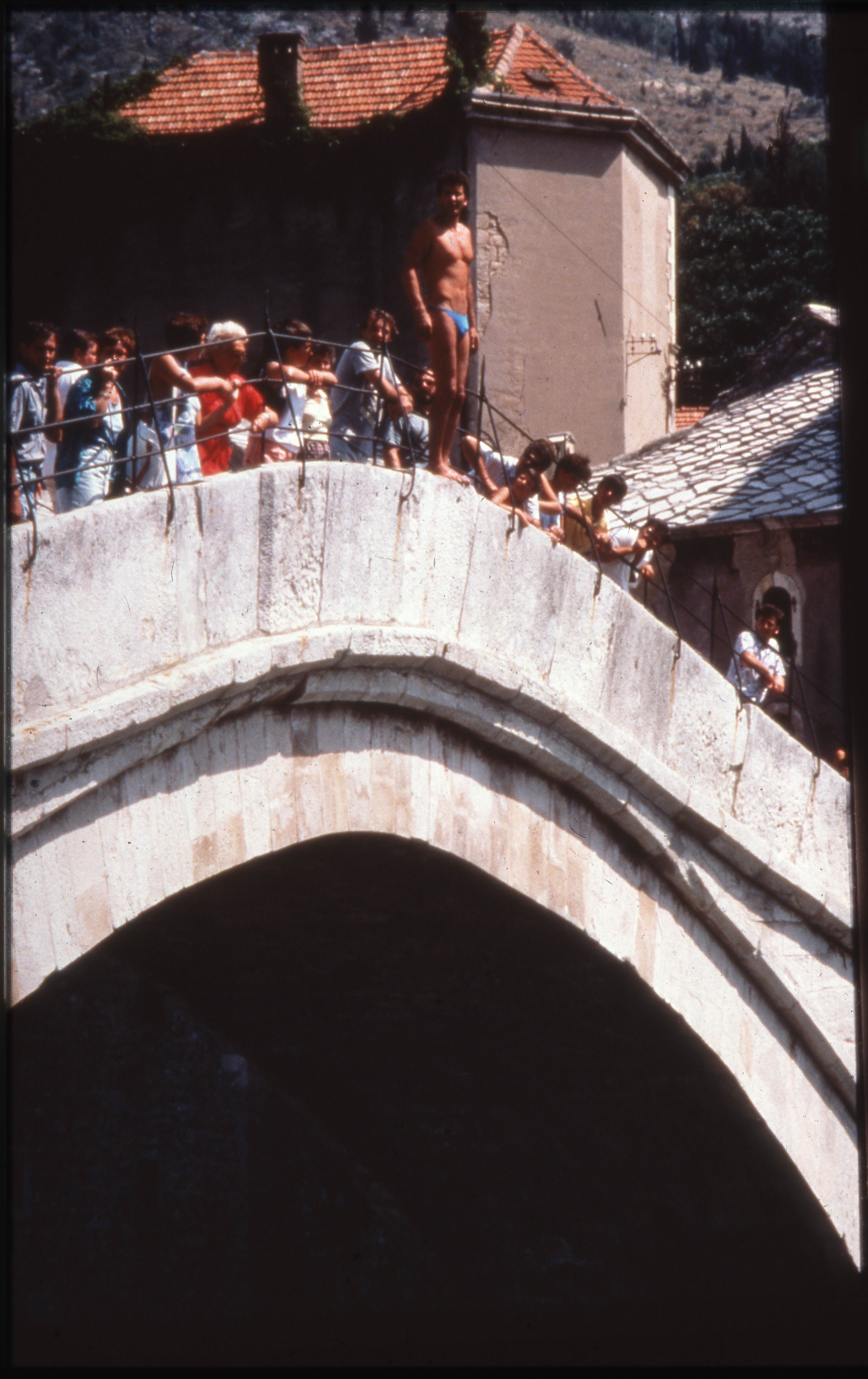 Photograph was taken during the cliff-diving championship organized for celebrating the rebuilding of the Bridge in 1986.