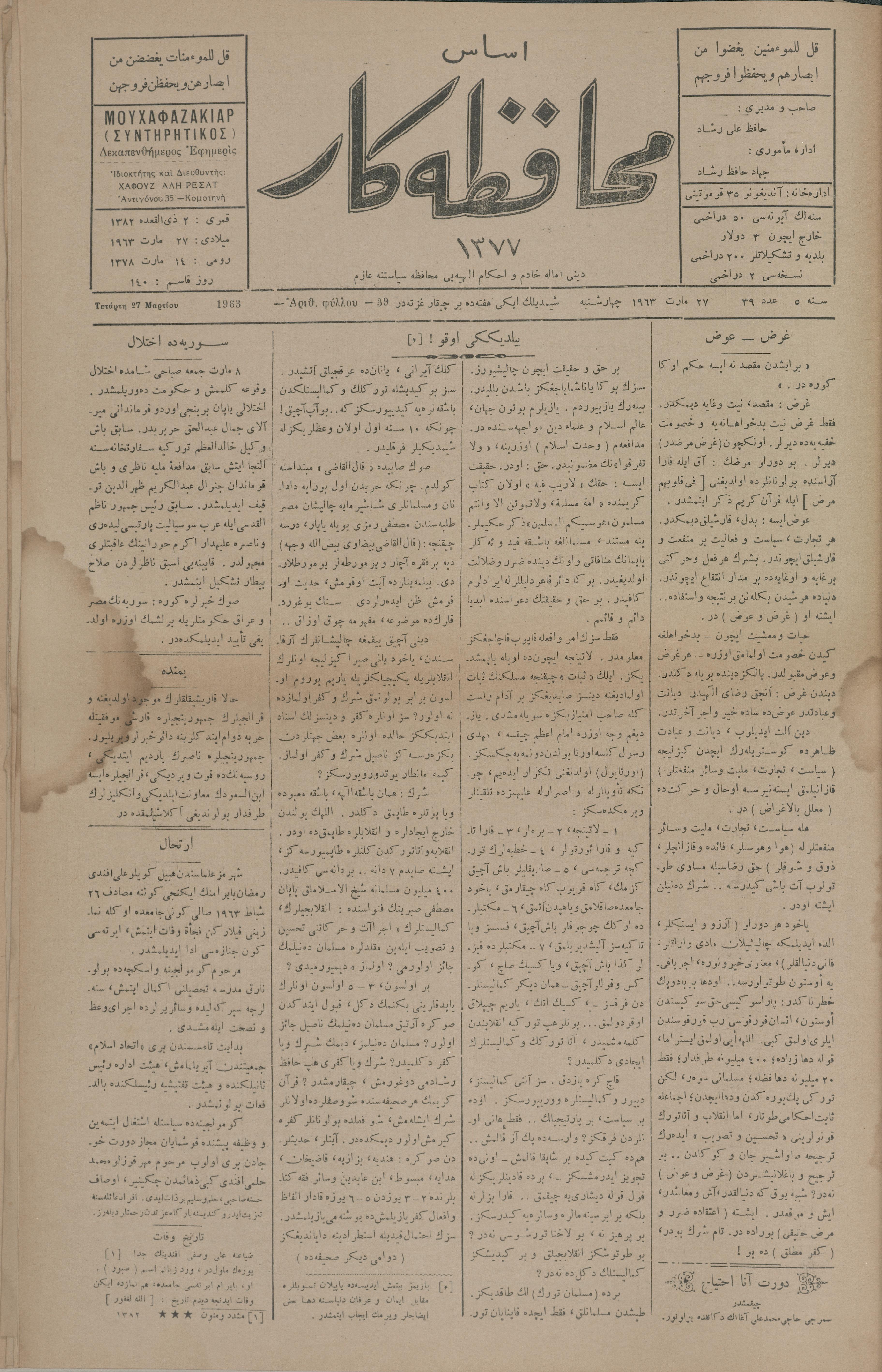 Esas muhafazakâr 1377, 27 Mart 1963 Sene 5 Aded 39