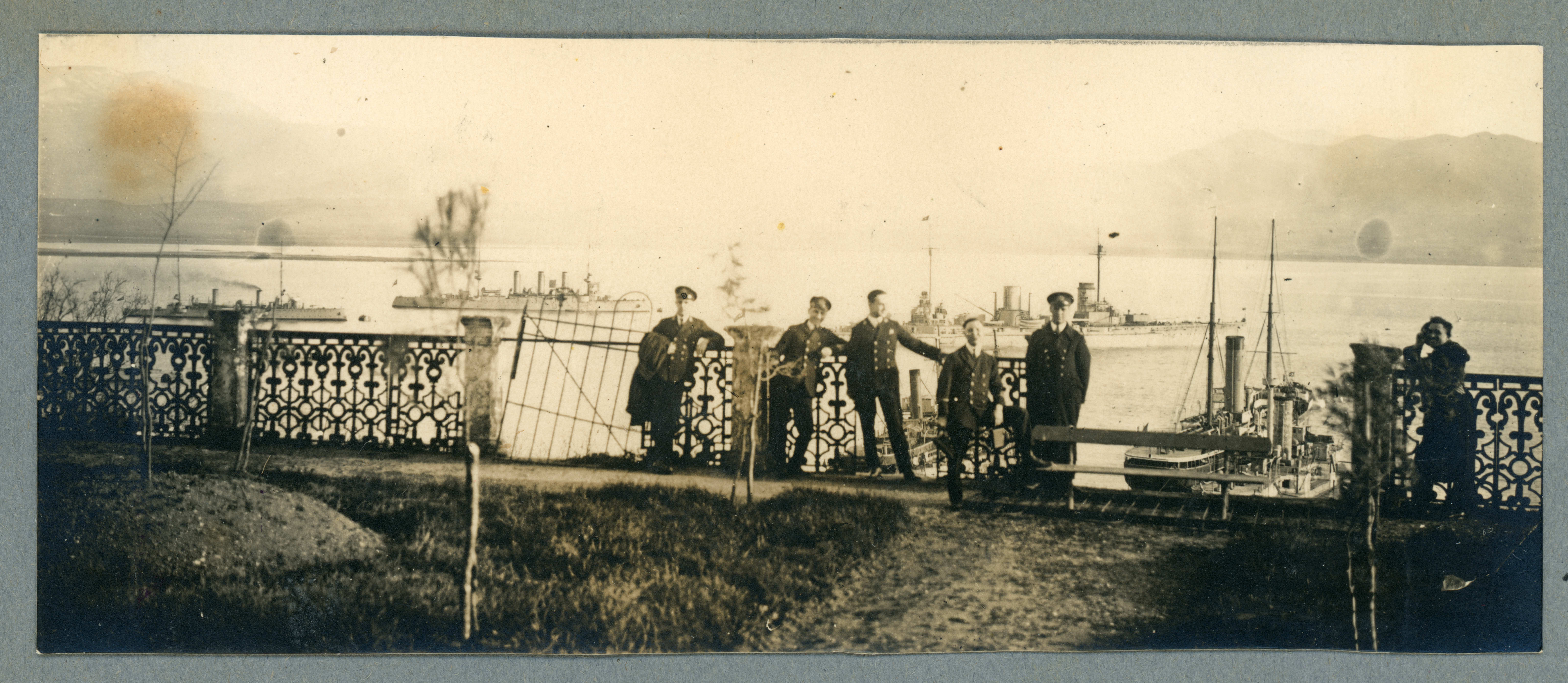 İzmir Körfezi'ne demirleyen Türk donanma gemileri ve hatıra fotoğrafı çektiren bahriye subayları