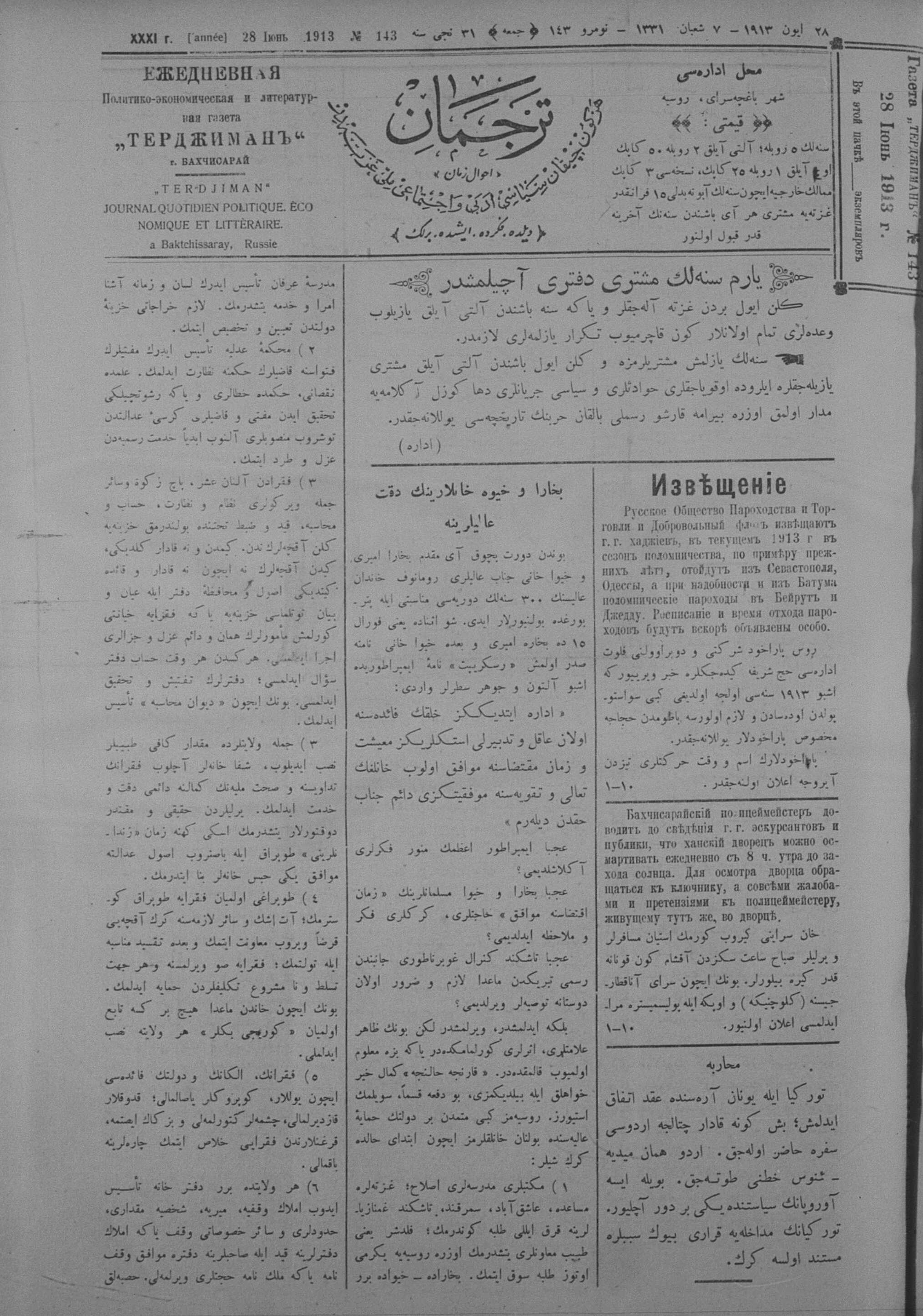 Tercüman, 28 June 1913 Year 31 No 143
