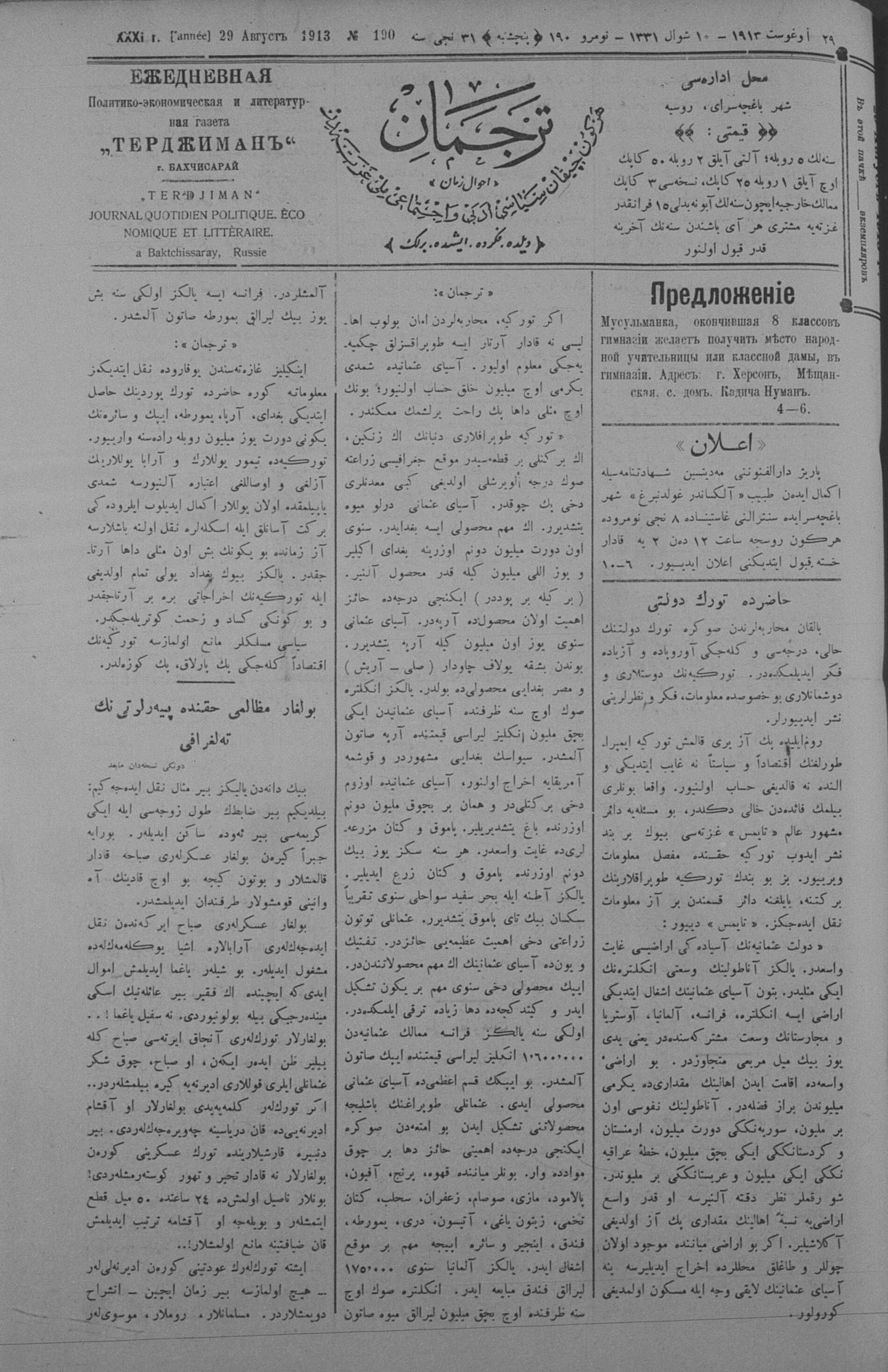 Tercüman, 29 August 1913 Year 31 No 190