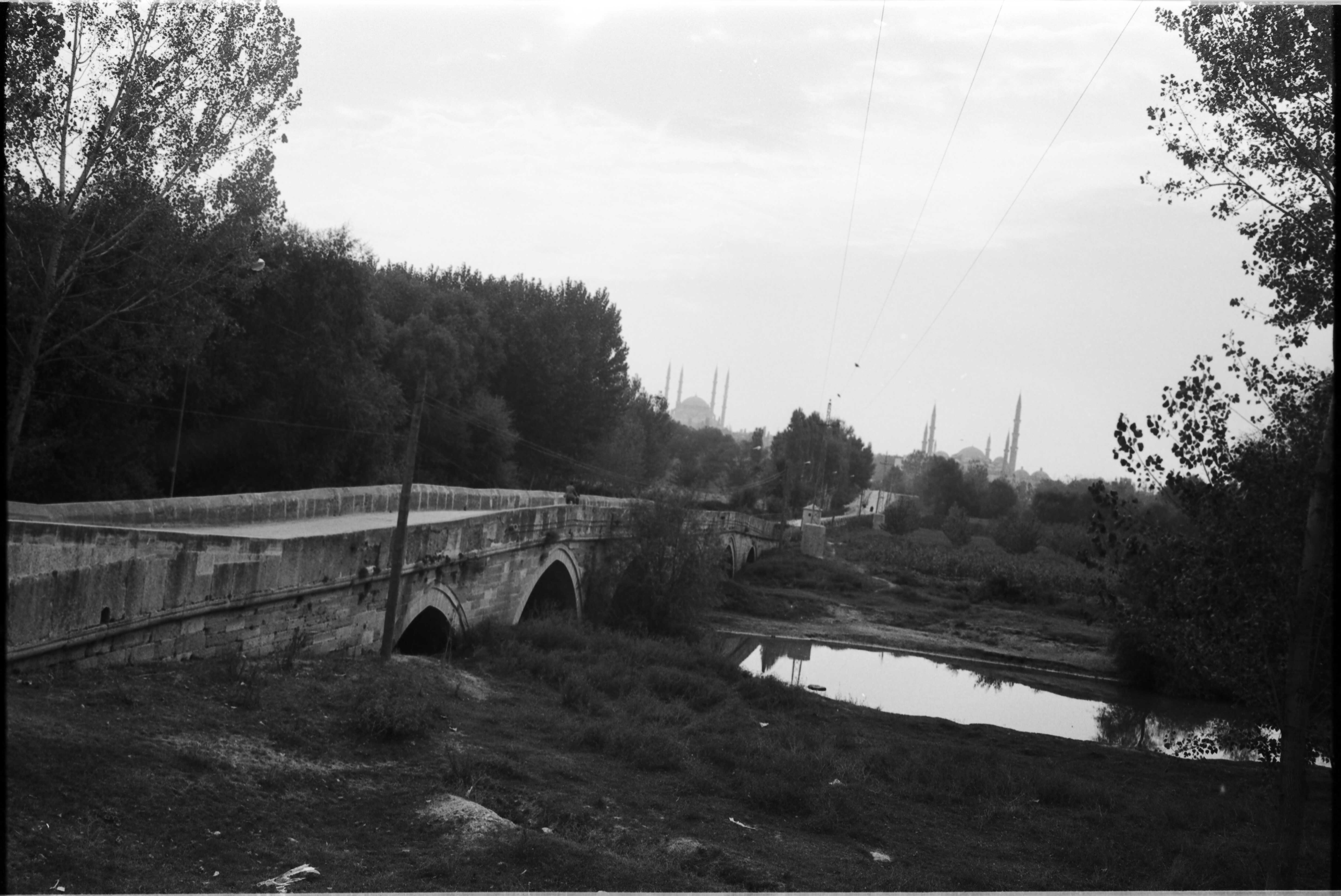 Edirne'de Tunca Nehri üzerindeki köprü ve uzaktan Selimiye Camii'nin görünüşü