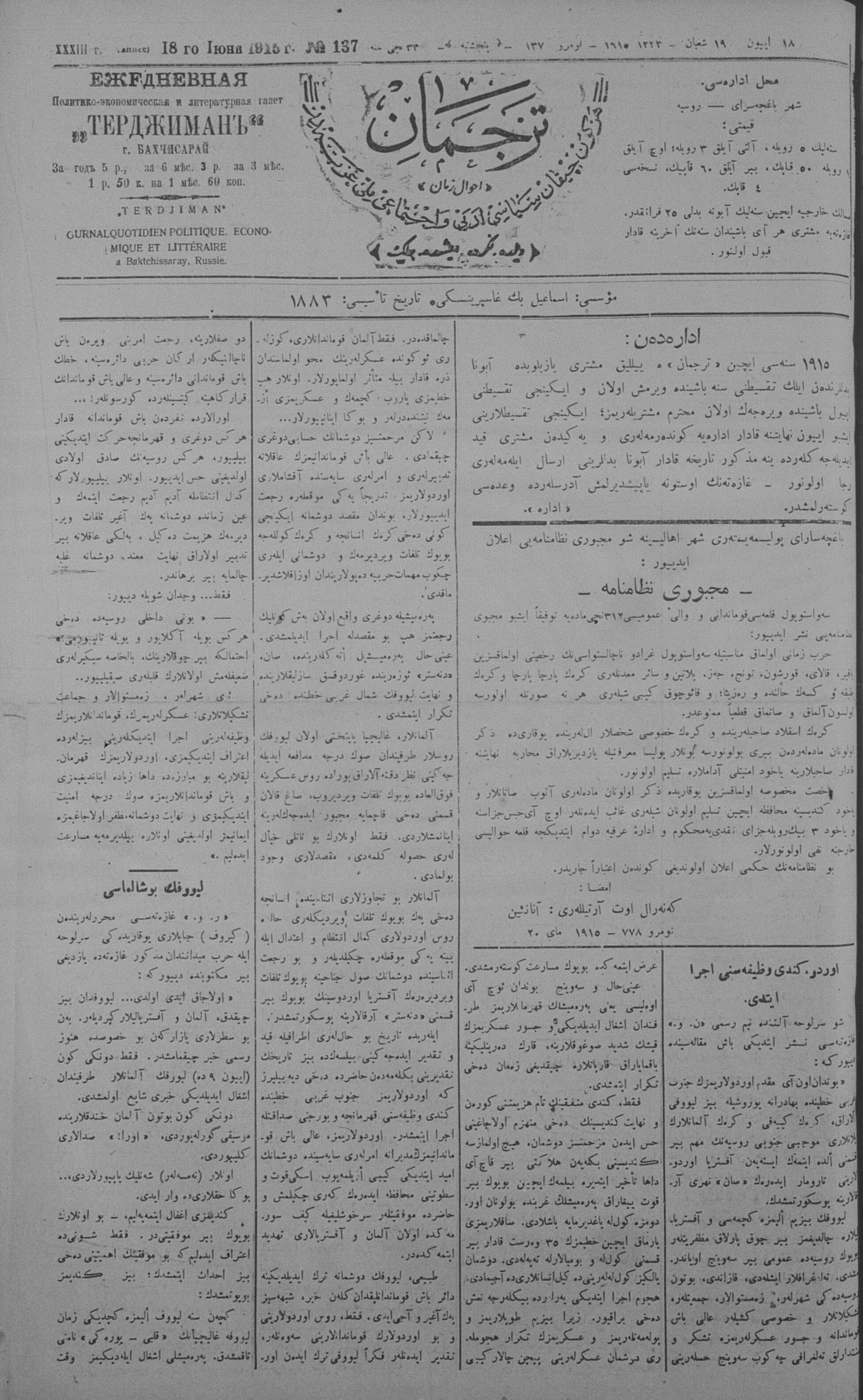 Tercüman, 18 June 1915 Year 33 No 137