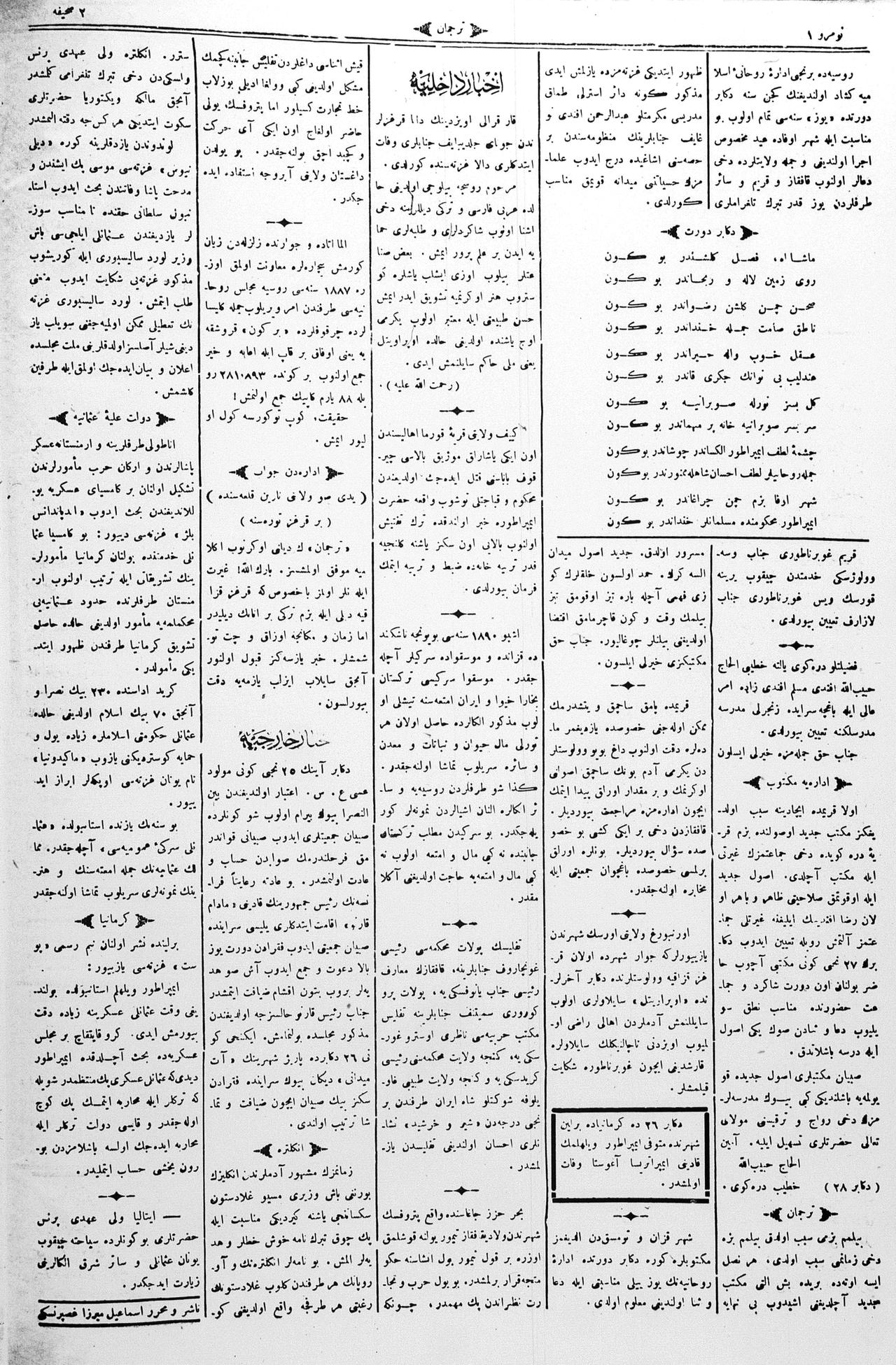 The name of the newspaper changed to Tercüman-ı Ahval-i Zaman in 1905. In 1909, it started to be published under its first name, Tercüman.