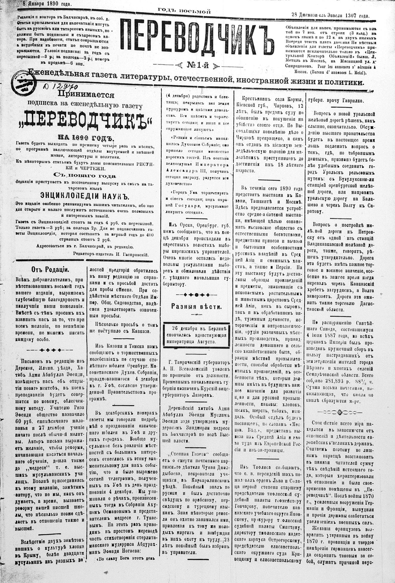 Turkish-Russian newspaper published in Crimea by İsmail Gaspıralı.