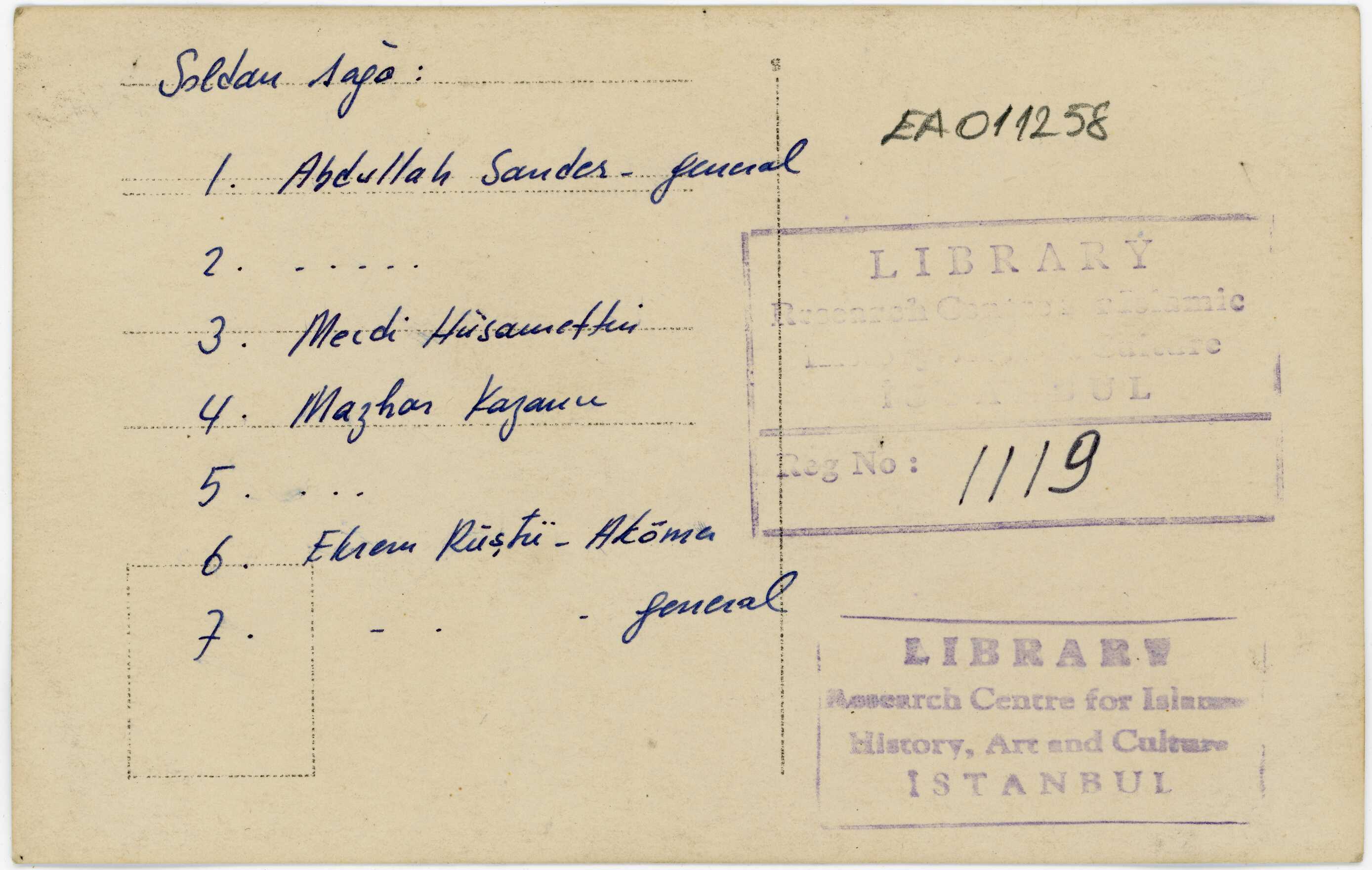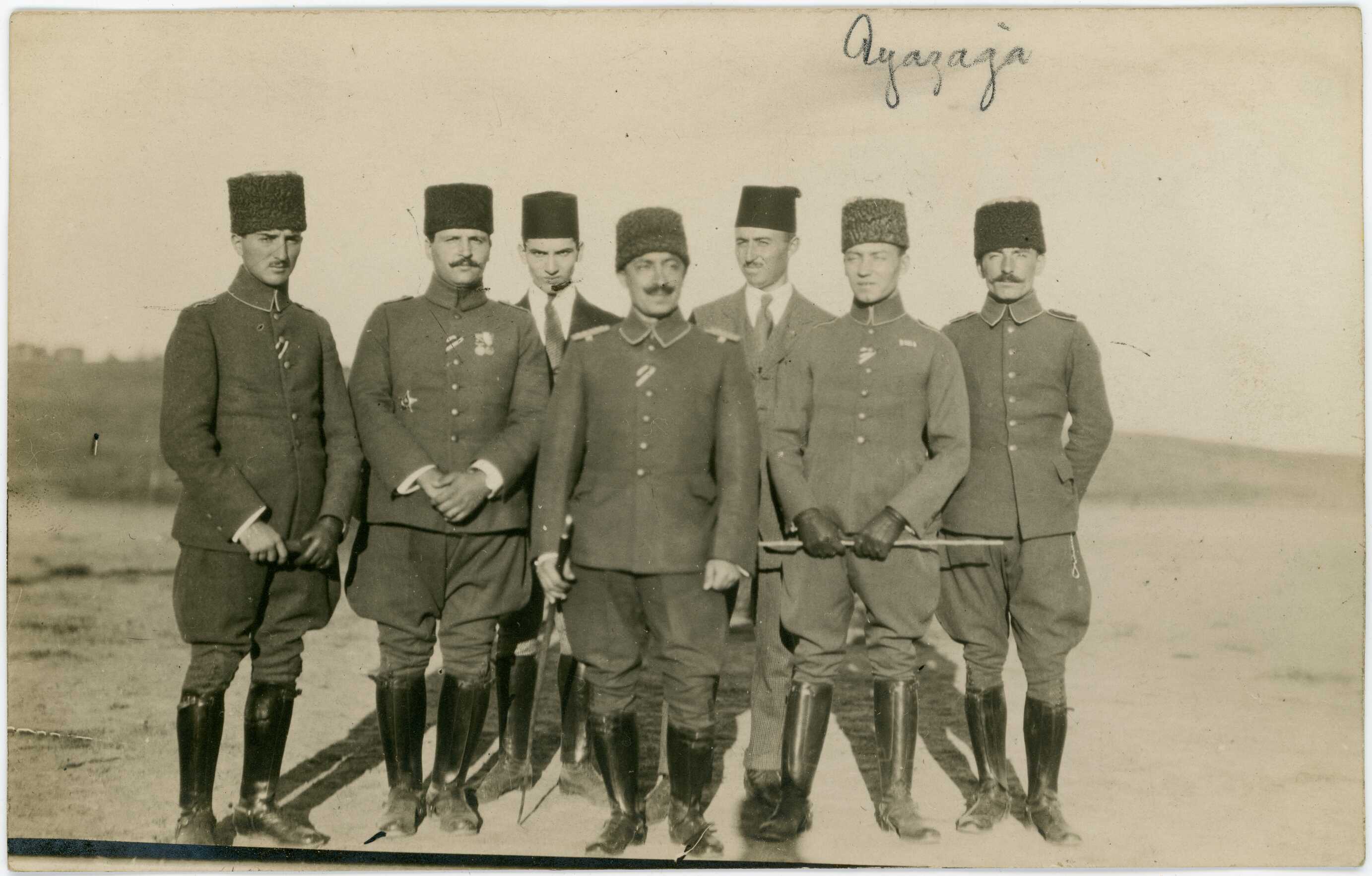 From left to right: 1- Abdullah Sander (General), 2-?, 3- Mecdi Hüsameddin, 4- Mazhar Kazancı, 5-?, 6- Ekrem Rüştü Akömer, 7-? (General).