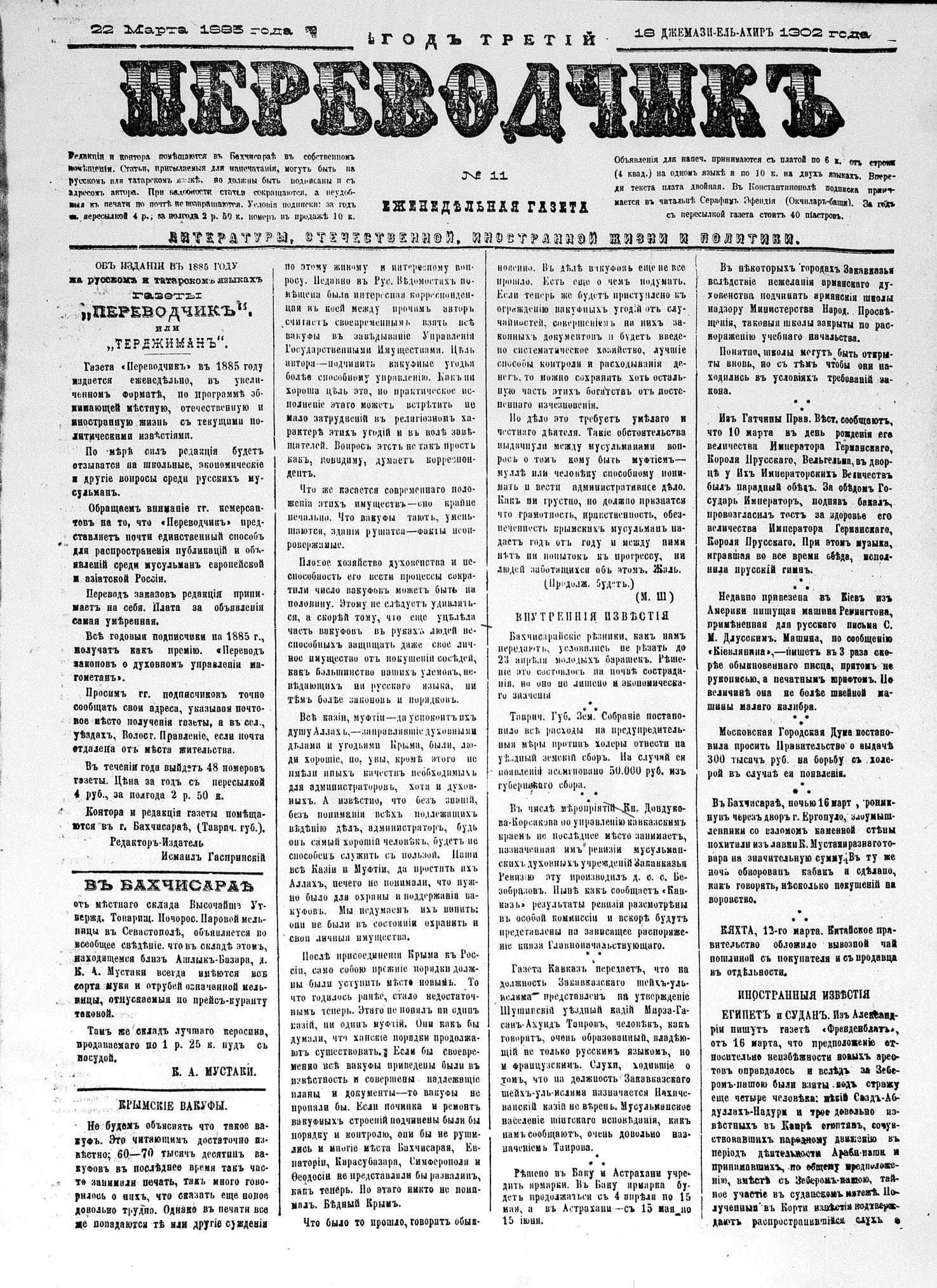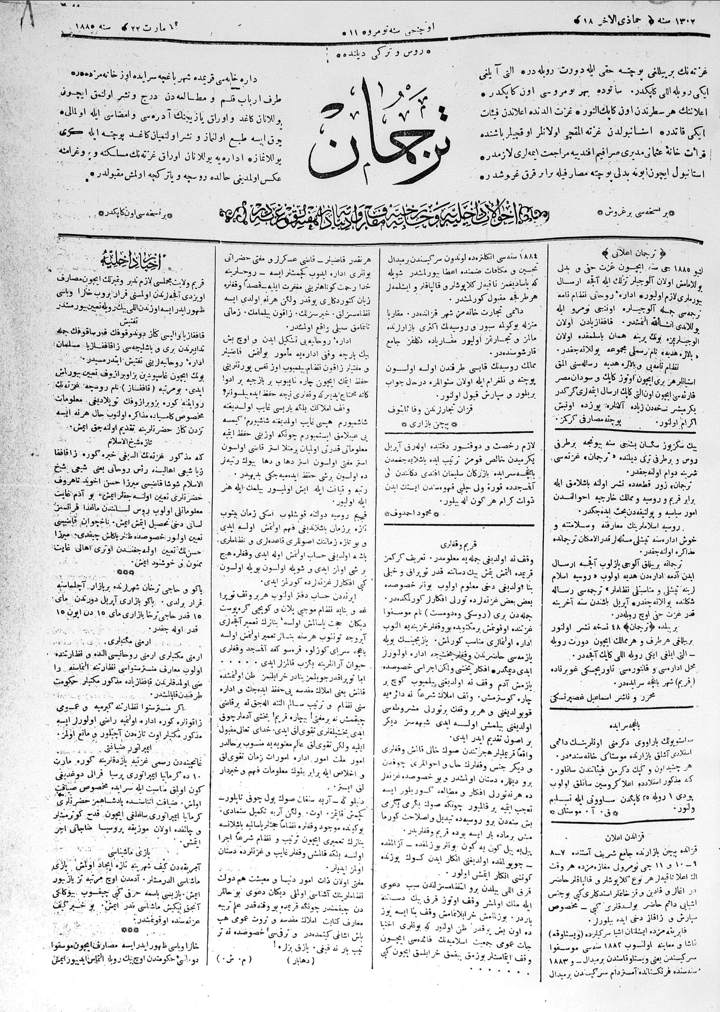 Turkish-Russian newspaper published in Crimea by Gaspirali Ismail Bey.