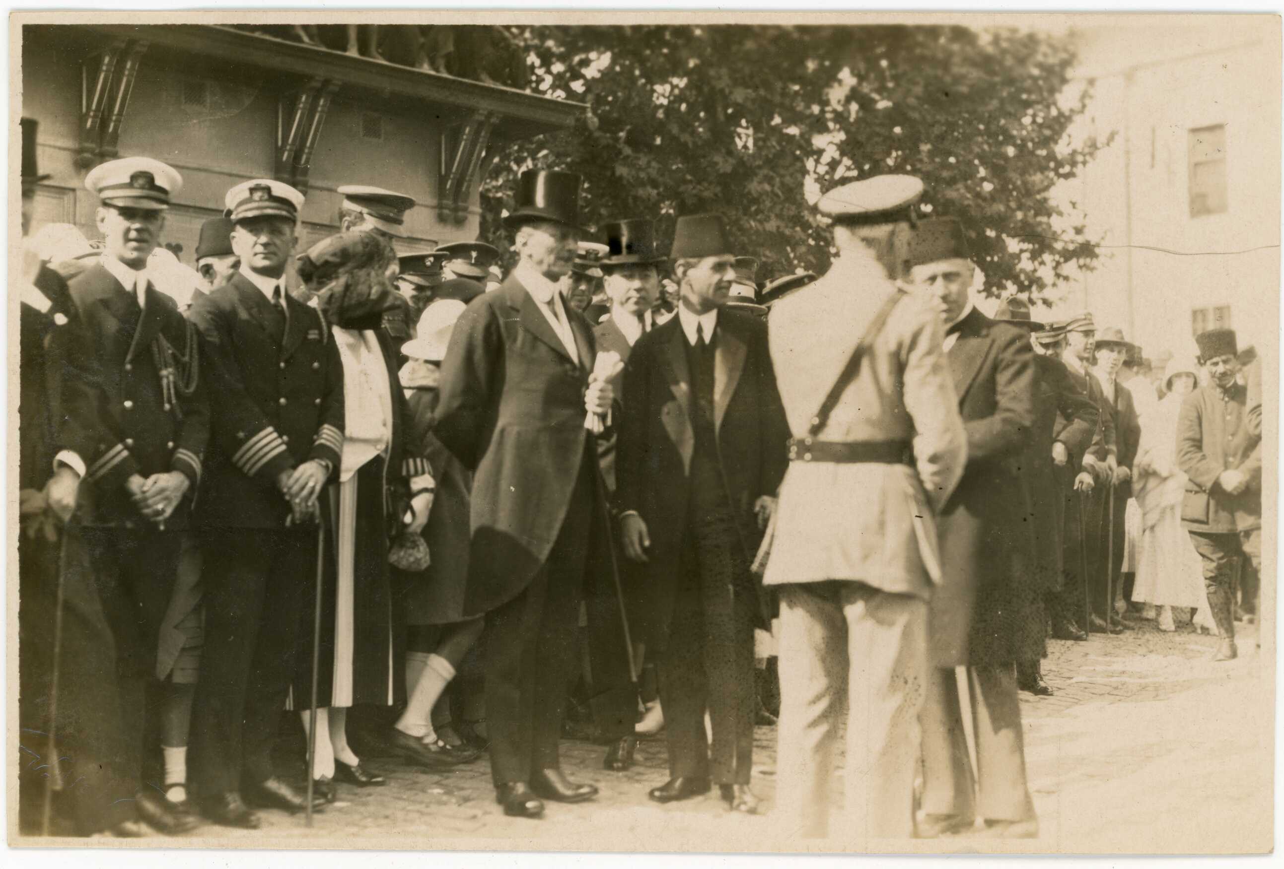 İtilaf Devletleri İstanbul'u terkederken Dolmabahçe Meydanı'nda yapılan törende Türk temsilcisi Adnan Adıvar yabancı temsilcilerle görüşürken