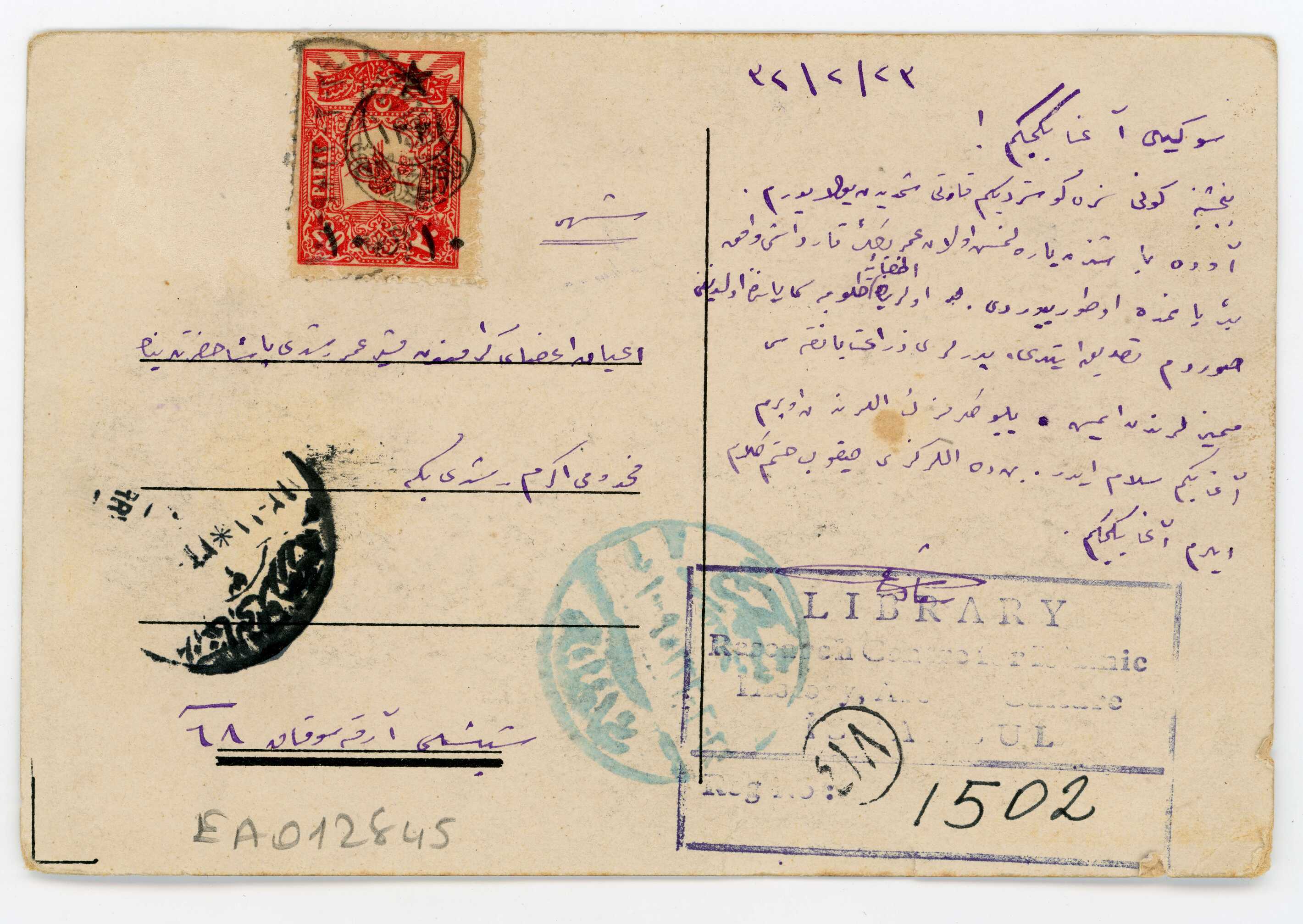 The postcard that Suat Bey sent to Ekrem Rüştü Akömer regarding the matters such as the card he sent on Thursday and Ömer Bey being injured in the head while hunting.