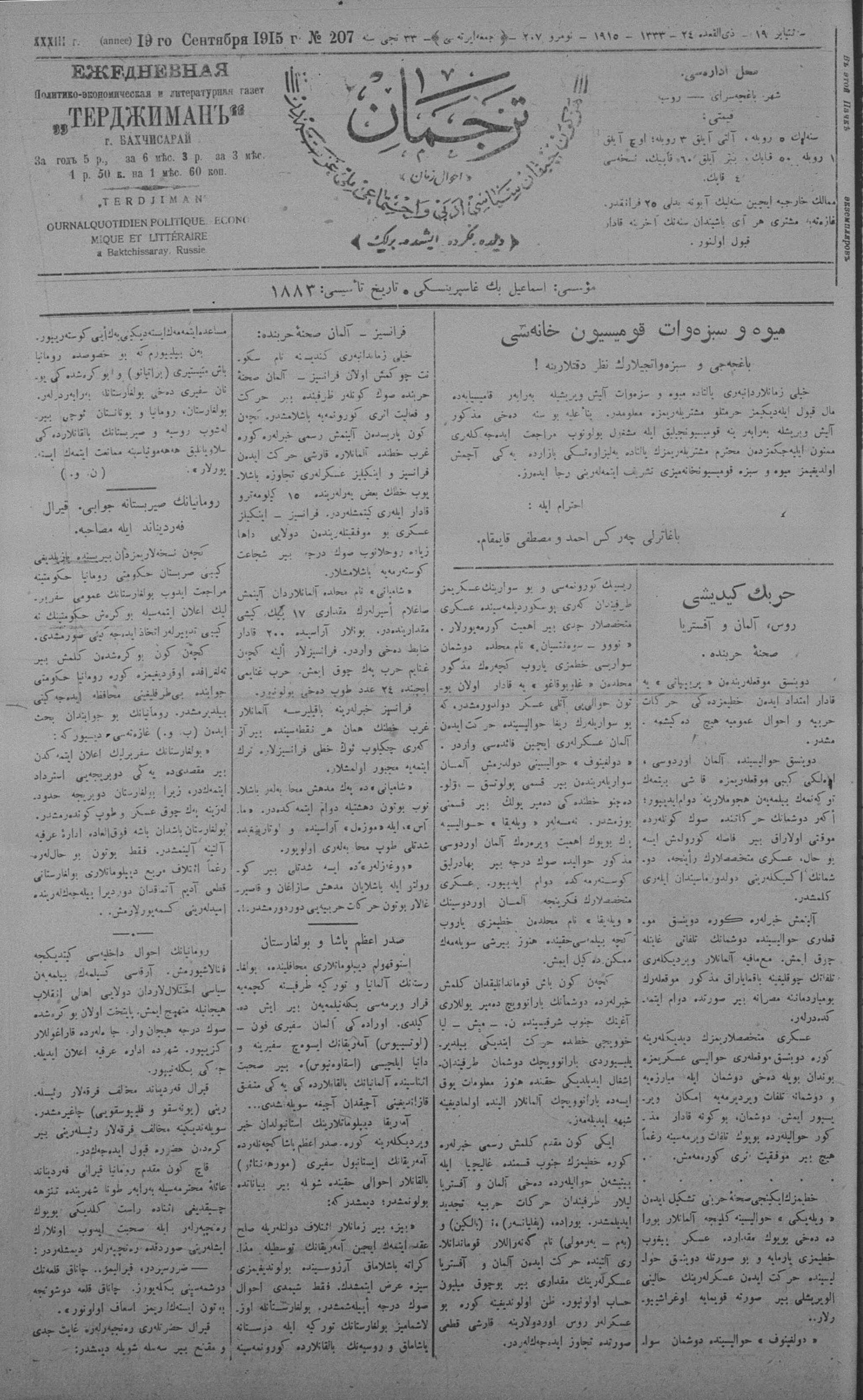 Tercüman, 19 September 1915 Year 33 No 207