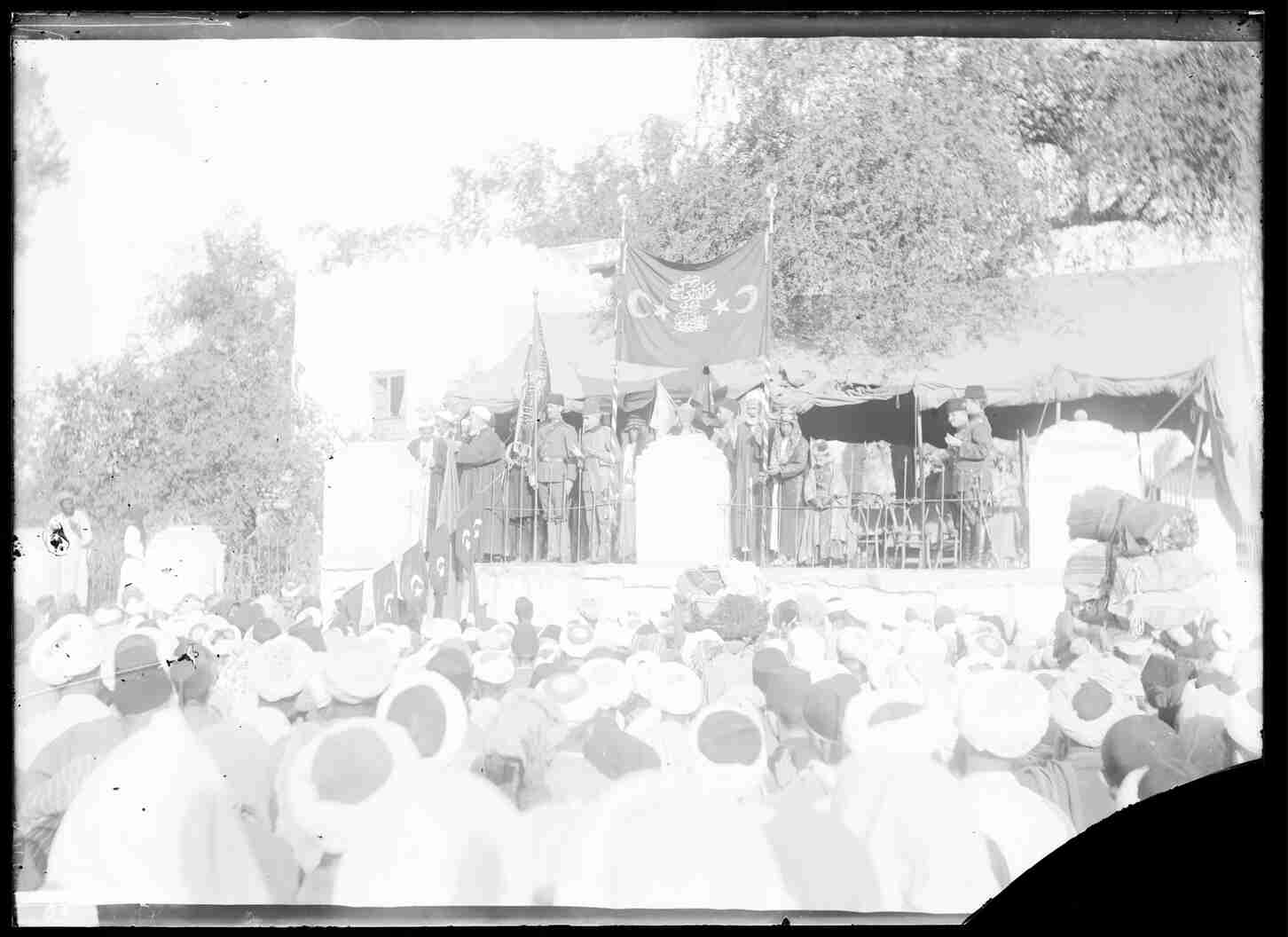 Medine`de Mukaddes Cihad ilanının Hicaz Valisi Basri Paşa, yüksek rütbeli görevliler ve şehrin ileri gelenlerinin dualarıyla okunuşu
