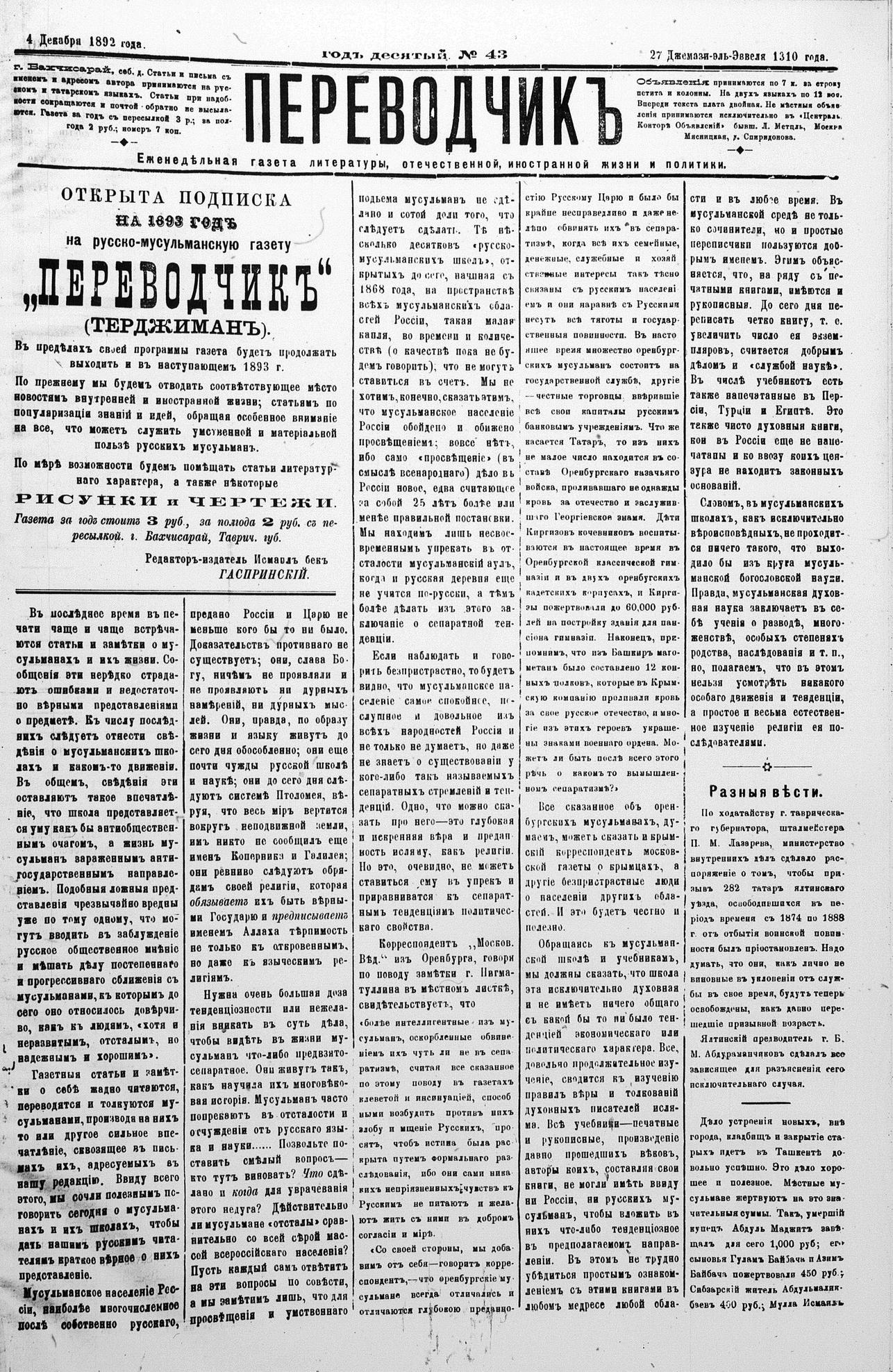 Turkish-Russian newspaper published in Crimea by İsmail Gaspıralı.