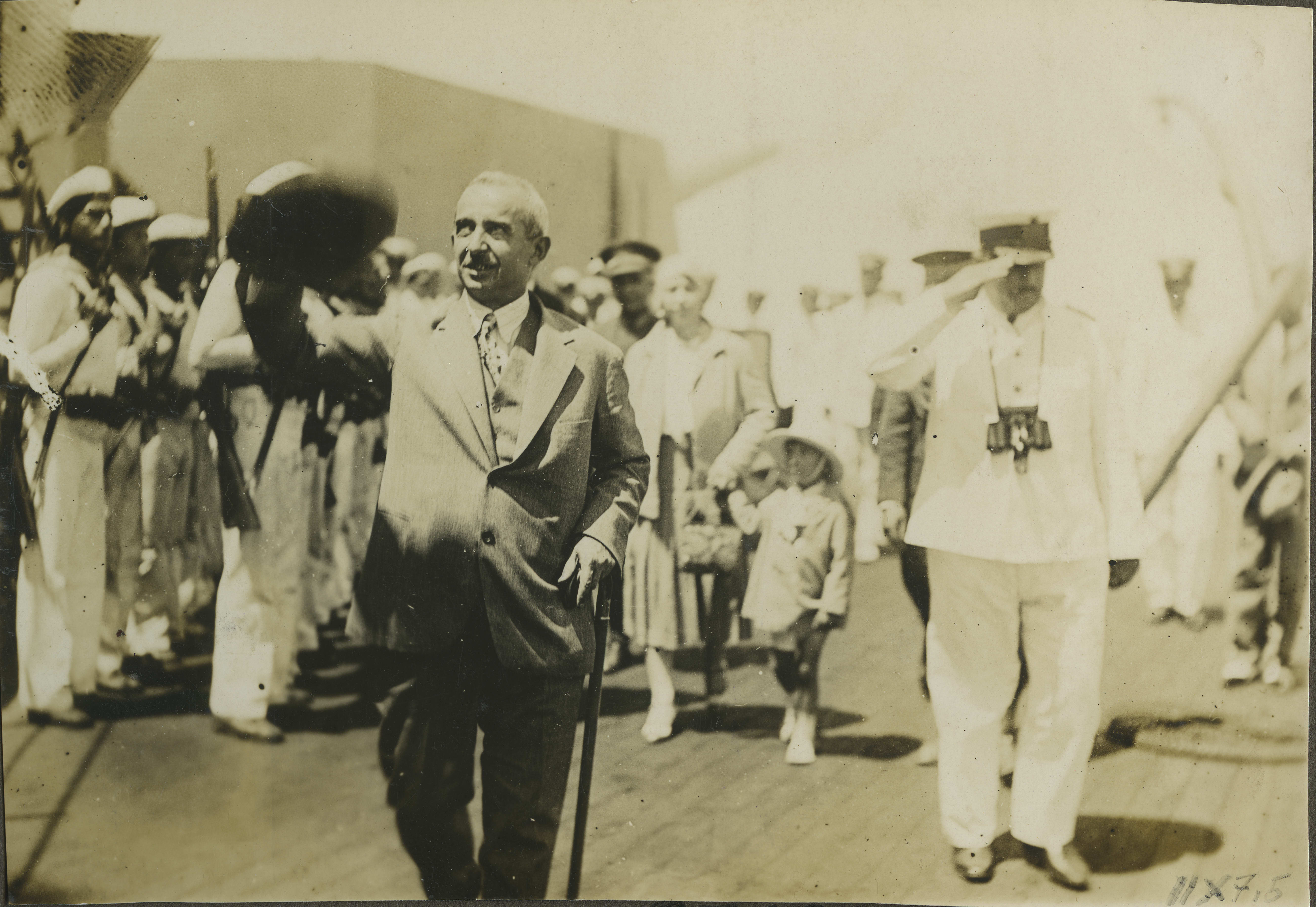 İsmet İnönü savaş gemisinin güvertesinde bahriyelileri selamlarken
