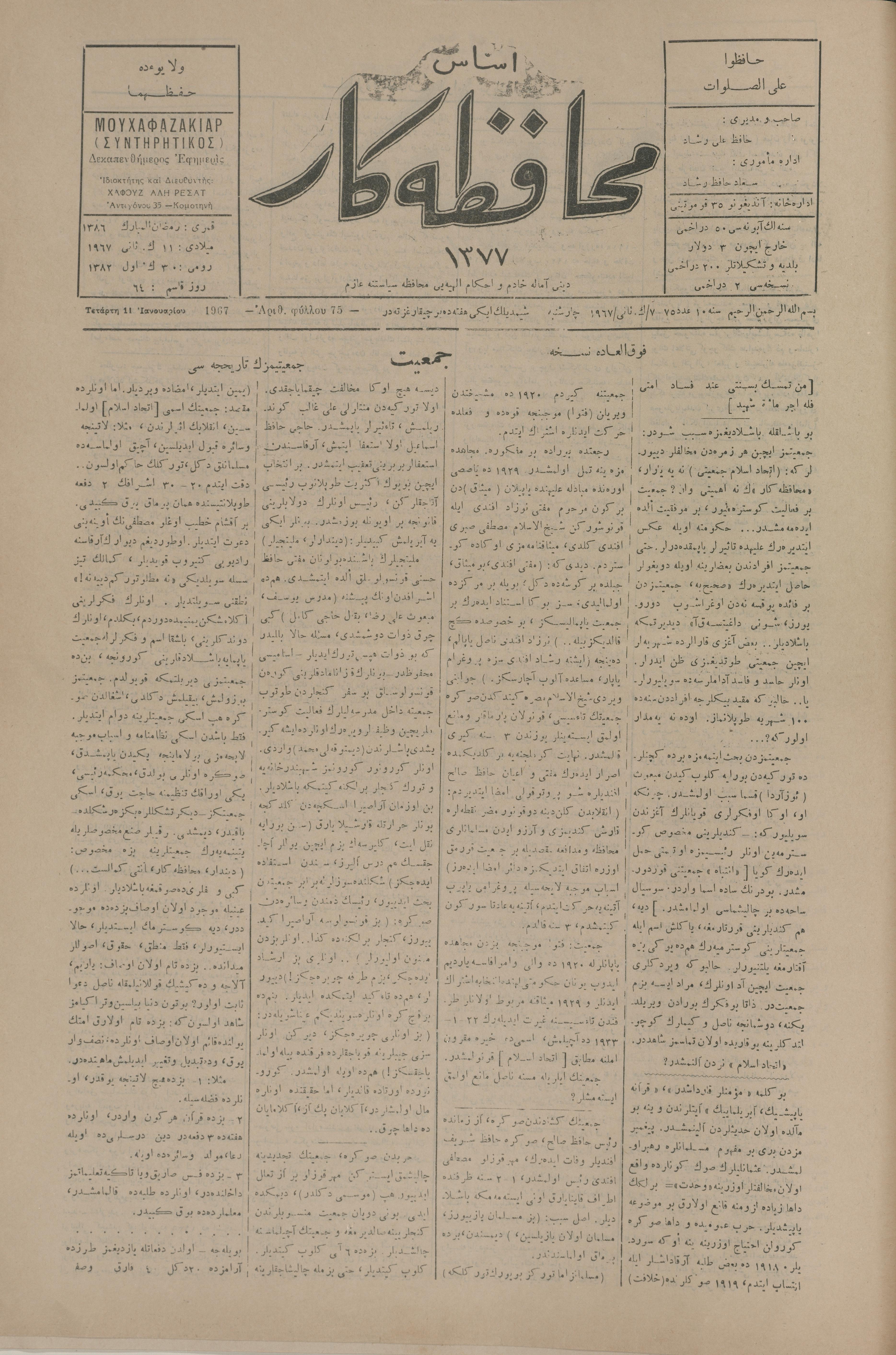 Esas muhafazakâr 1377, 7 Ocak 1967 Sene 10 Aded 75