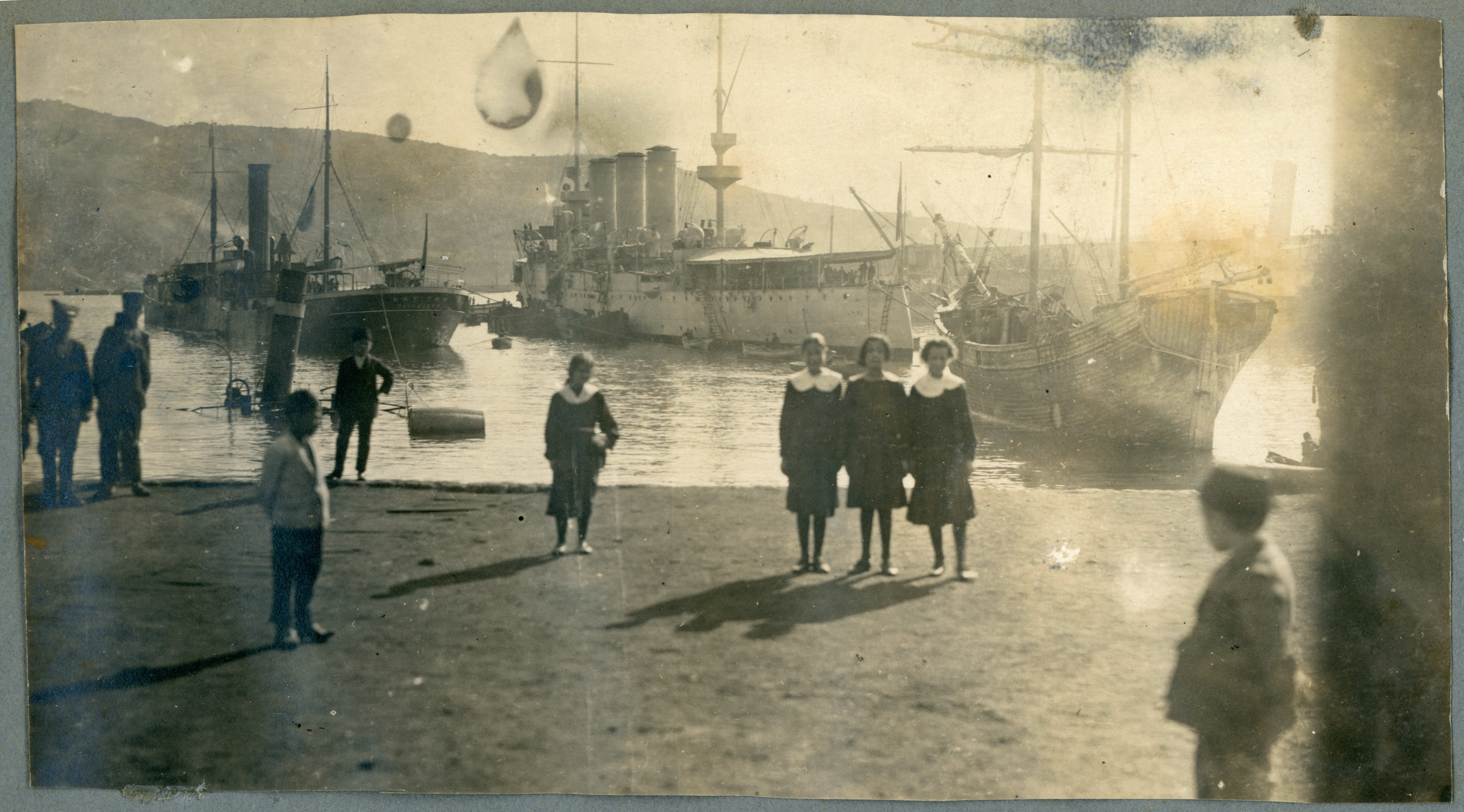 Boğaziçi'nde limana demirlemiş Türk donanme gemilerinden birinin önünde fotoğrafları çekilen kız öğrenciler