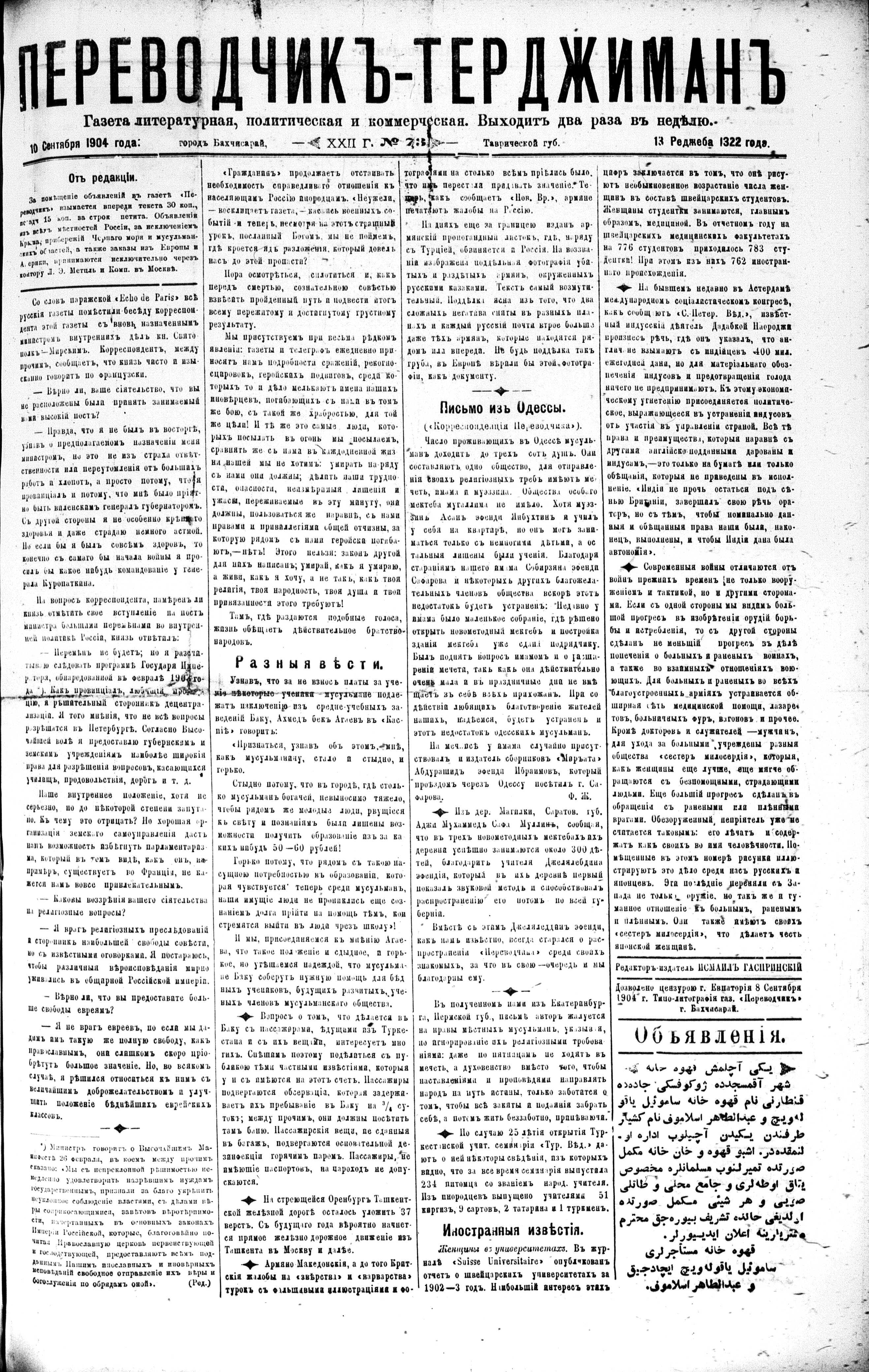 Turkish-Russian newspaper published in Crimea by İsmail Gaspıralı.