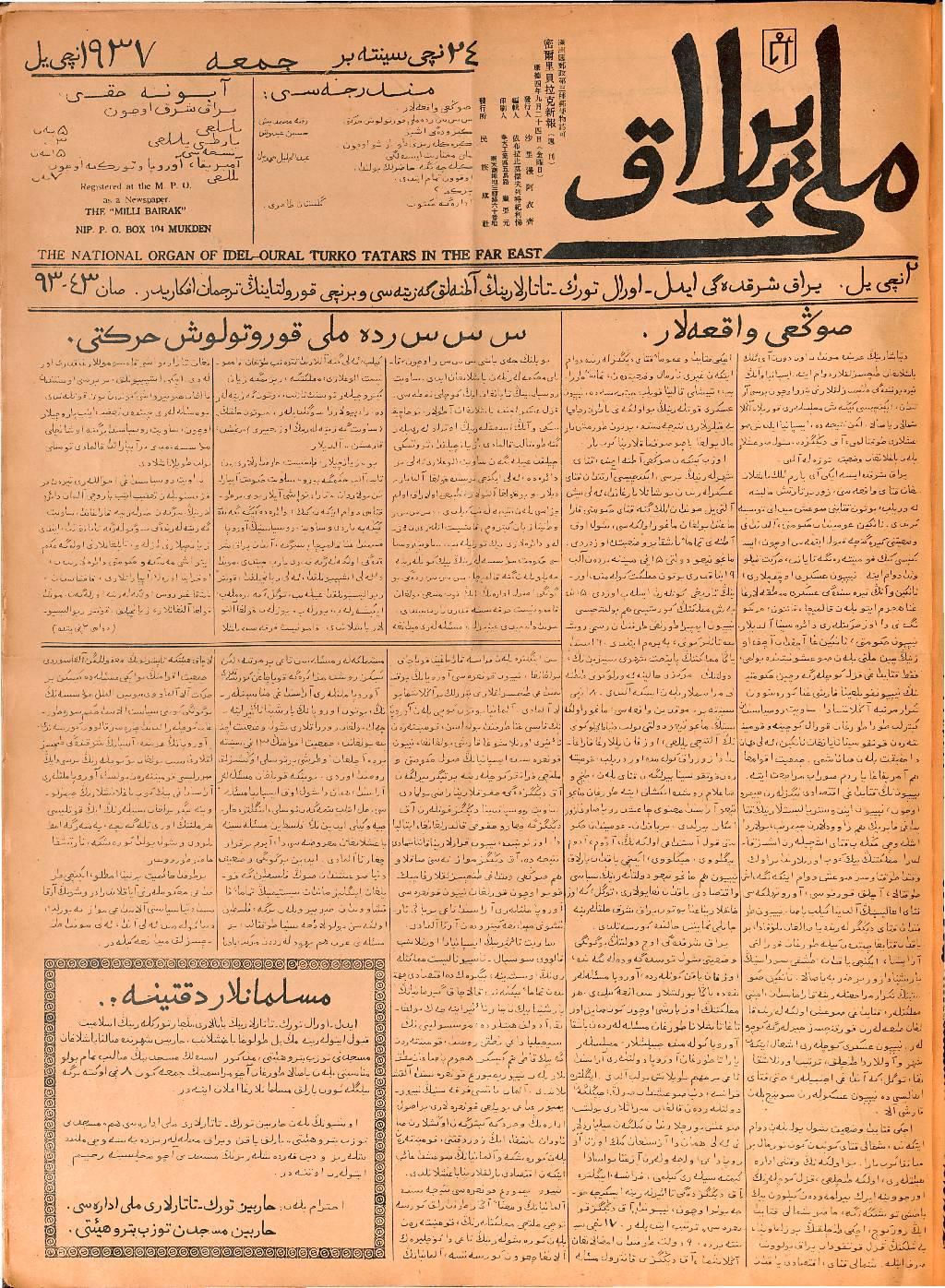 The Milli Bayrak newspaper was printed in Mukden.